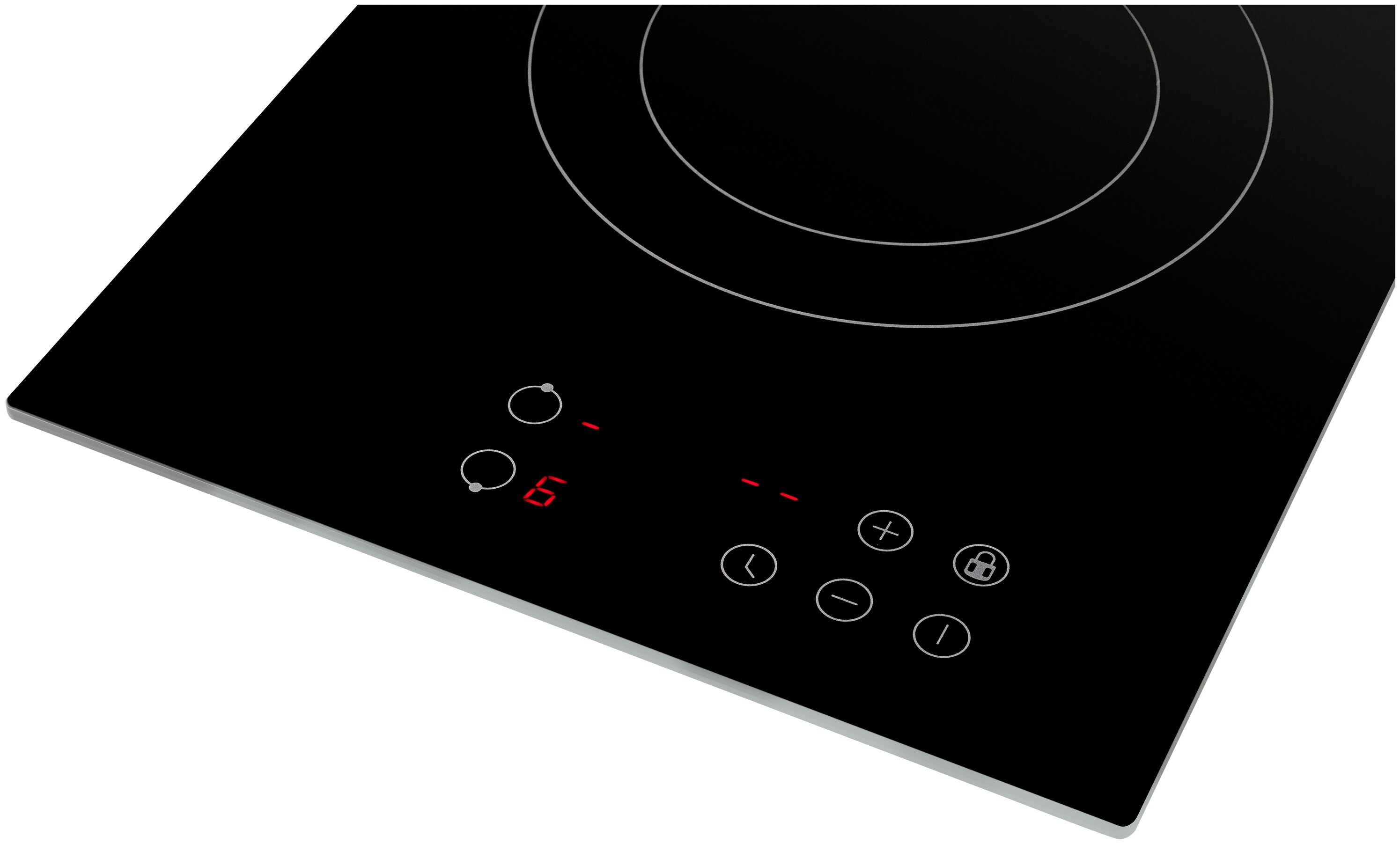 защитное отключение конфорок, индикатор остаточного тепла, кнопка блокировки панели