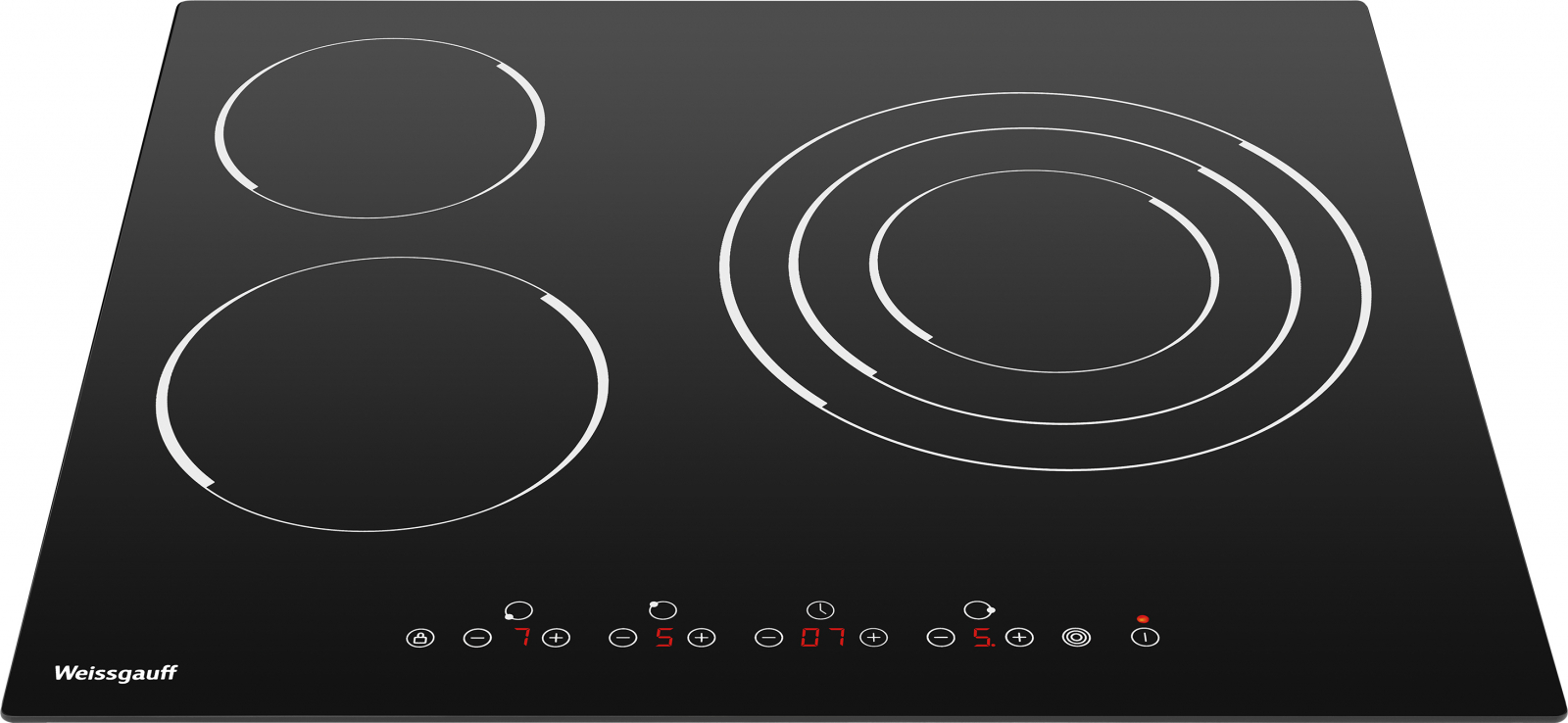 Конфорки: 3 конфорки: 1x 165 мм*1,2 кВт (задняя левая), 1х 200 мм*1,8 кВт (передняя левая), 1 х 140/210/300 мм*1,05/1,95/2,7 кВт (тройной контур)