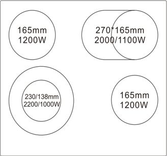 Левая ближняя конфорка: мощность 1000/2200 Вт размер138/230 мм