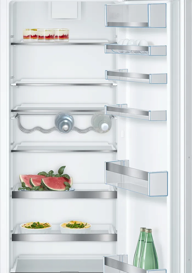 Встраиваемый однокамерный холодильник Bosch KIR81AF30U — это современное устройство, отличающееся продуманным дизайном и функциональностью. Благодаря своему внешнему виду, он легко впишется в любой интерьер. Белый цвет корпуса подчеркивает чистоту и свежесть, а компактные размеры позволяют установить его даже в небольшой кухне. Продуманная конструкция устройства позволяет максимально эффективно использовать пространство. Внутри холодильника находится 7 полок, 6 из которых можно регулировать по высоте, что позволяет удобно разместить продукты различных размеров. Одна полка фиксированная, что обеспечивает дополнительную стабильность при хранении тяжелых продуктов. Все полки изготовлены из высокопрочного стекла, что обеспечивает их долговечность и удобство в использовании. Особенностью этой модели является наличие выдвижного контейнера MultiBox, который идеально подходит для хранения фруктов и овощей. Благодаря специальной системе охлаждения, продукты остаются свежими и сохраняют свои полезные свойства на долгое время. Также в холодильнике есть выдвижные полки EasyAccess, которые облегчают доступ к продуктам. Система управления в холодильнике электронная, что обеспечивает точность и удобство в использовании. С помощью кнопок можно легко установить необходимую температуру и выбрать нужный режим работы. Наличие дисплея позволяет контролировать все процессы и оперативно реагировать на изменения. Встроенная система суперохлаждения позволяет быстро охладить продукты, что особенно актуально в жаркую погоду или при хранении большого количества свежих продуктов. В холодильнике есть специальная зона свежести VitaFresh plus, которая поддерживает оптимальные условия для хранения различных продуктов. Важным преимуществом этой модели является высокий класс энергопотребления. Благодаря использованию современных технологий и материалов, холодильник потребляет минимальное количество электроэнергии, что позволяет экономить на коммунальных платежах.