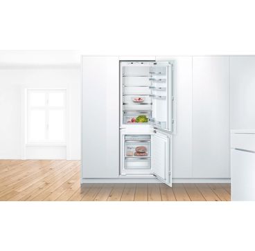 Холодильник Bosch KIS86AFE0 имеет полезный объем в 265 литров, из которых 74 л приходятся на расположенную внизу морозилку. Тут находятся три выдвижных ящика, включая большой контейнер BigBox, в котором поместятся крупные замороженные продукты, к примеру, тушка индейки. В морозильной камере за сутки можно заморозить до 7 кг, а время автономного сохранения холода при перебоях с электричеством достигает 32 часов. В 191-литровом холодильном отделении помимо привычных открытых полок имеется выдвижная EasyAccess, призванная упростить загрузку/выгрузку и обеспечить хорошую обзорность продуктов. Также нашлось место для зоны свежести FreshSafe и 5 дверных карманов. К другим плюсам модели относится режим отпуска, низкое энергопотребление (класс A++) и весьма тихая работа (до 36 дБ)