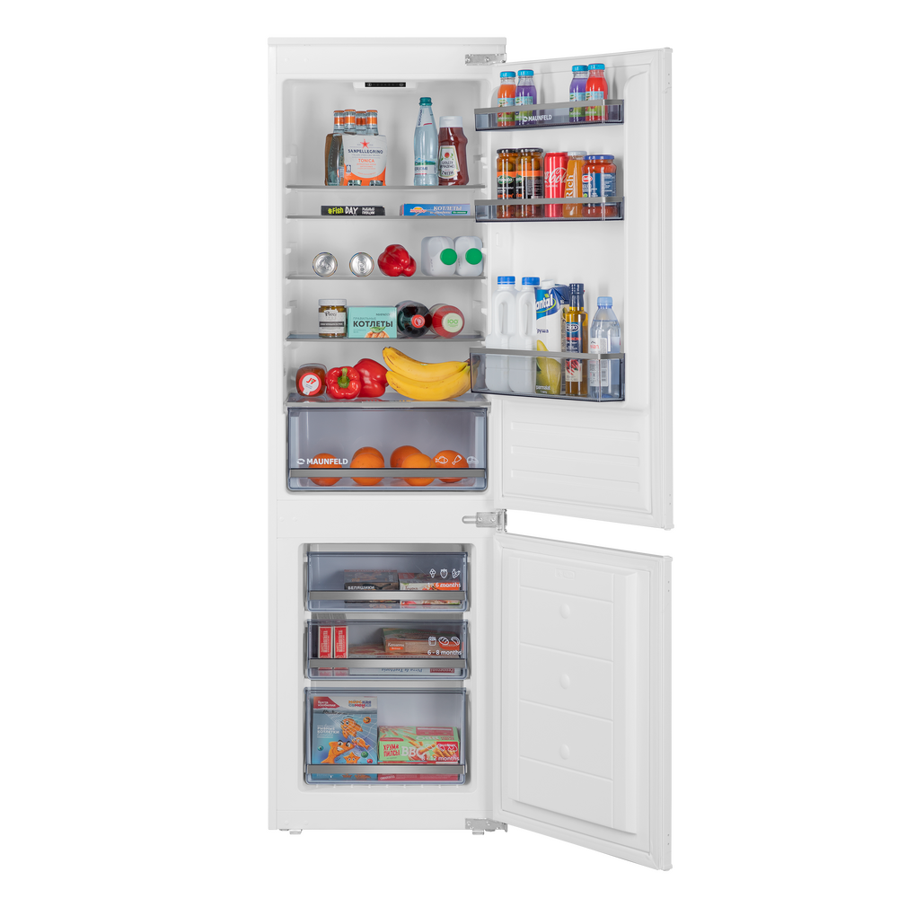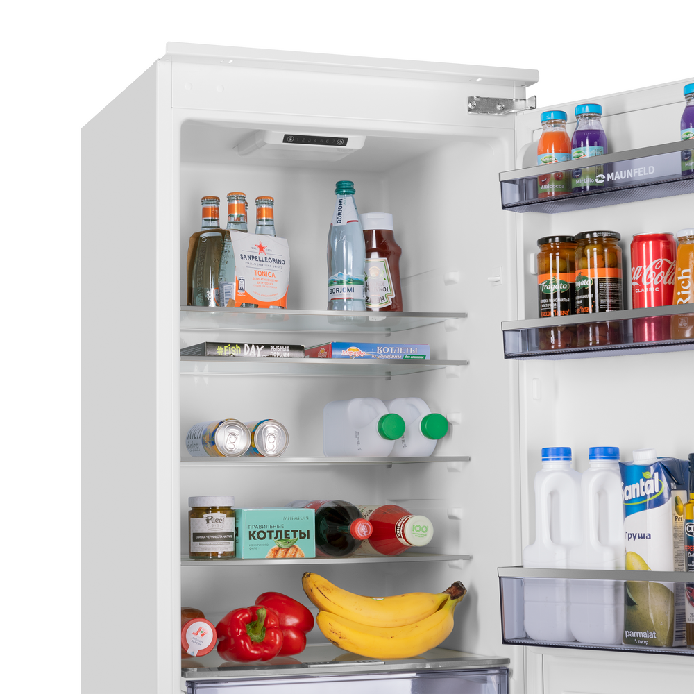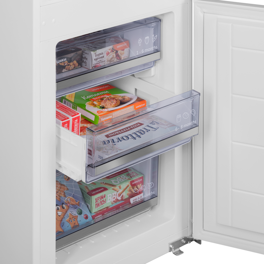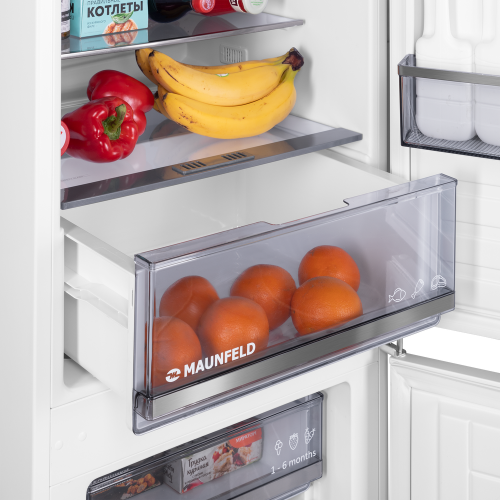 Встраиваемый холодильник с морозильной камерой Maunfeld MBF177SWGR станет незаменимым помощником на вашей кухне. Двухкамерная модель имеет две двери, что обеспечивает удобный доступ к продуктам. Дизайн холодильника выполнен в стиле "Модерн", что позволяет ему гармонично вписаться в любой интерьер. Белый цвет корпуса делает модель визуально легкой и воздушной. Встроенный дисплей и кнопочное управление делают использование холодильника максимально комфортным и простым. Модель обладает классом энергопотребления A+, что говорит о ее высокой энергоэффективности. При этом уровень шума не превышает 39 дБ, что позволяет установить холодильник даже в небольших помещениях без боязни шума. Внутреннее пространство холодильника продумано до мелочей. Он оснащен четырьмя полками из закаленного стекла, высота которых регулируется в зависимости от потребностей пользователя. Также есть специальный ящик для хранения овощей и фруктов и три полки на двери для мелких продуктов и напитков. В комплекте поставляются два лотка для яиц. Морозильное отделение включает в себя три ящика, что позволяет эффективно использовать его объем. Мощность замораживания составляет 2,5 кг за 24 часа. Есть емкость для льда, что особенно пригодится в жаркие летние дни. Система охлаждения холодильника и морозильника статическая, что обеспечивает равномерное распределение температуры внутри камер. Размораживание отделений производится вручную, что позволяет сохранить продукты свежими и вкусными на протяжении длительного времени.