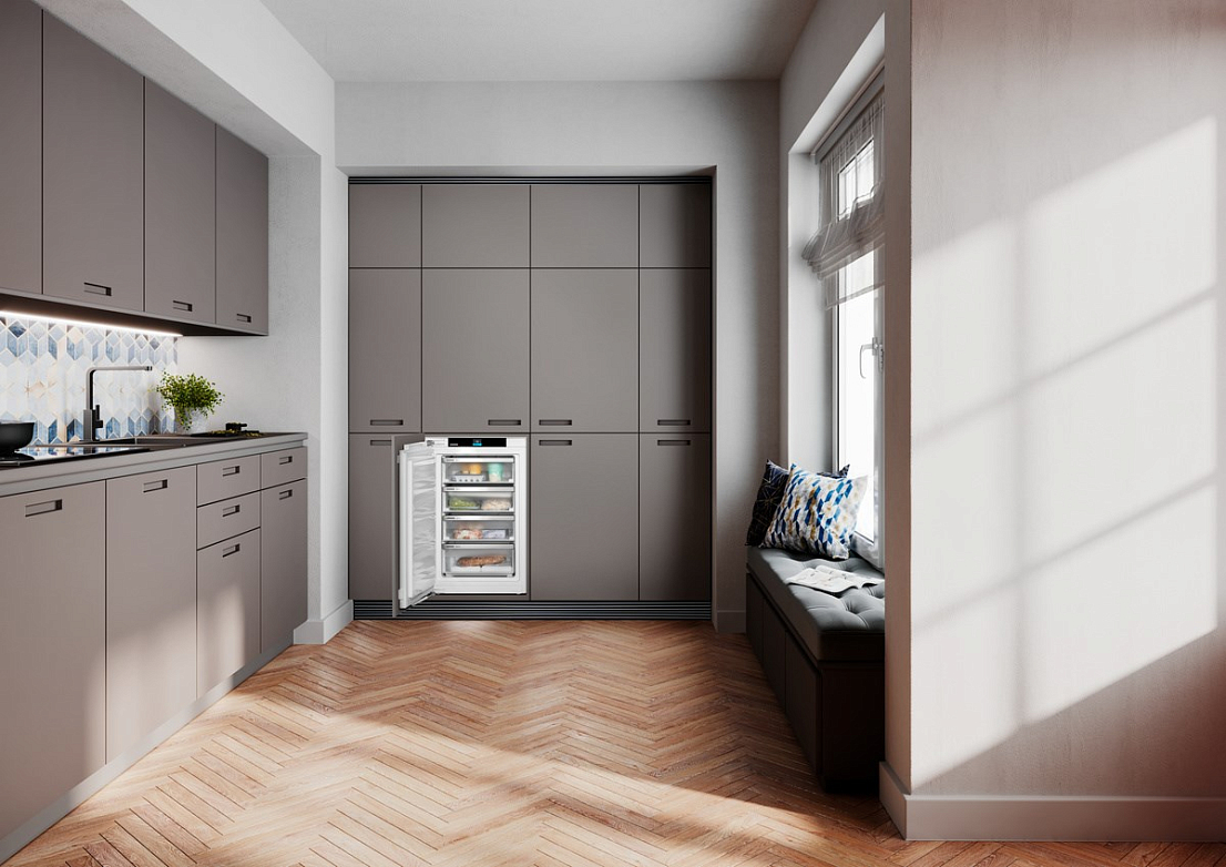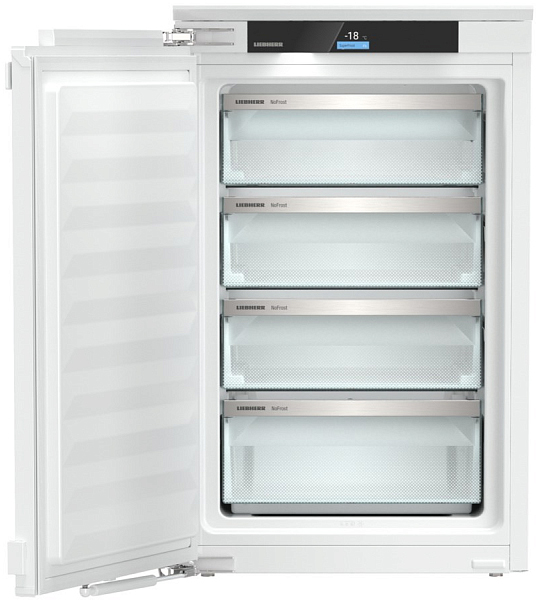 Встраиваемая морозильная камера Liebherr IFNd 3954 — это вместительная и функциональная модель. Она предполагает встраивание в гарнитур и имеет специальные крепления для фасада, что позволяет гармонично интегрировать ее в любой интерьер. Панель управления расположена в верхней части устройства в виде сенсорного дисплея Touch&Swipe. Понятный и интуитивный интерфейс дает возможность без проблем настраивать температуру и активировать нужные функции. Благодаря доводчику SoftSystem дверца закрывается плавно и бесшумно, что предотвращает возможные повреждения.