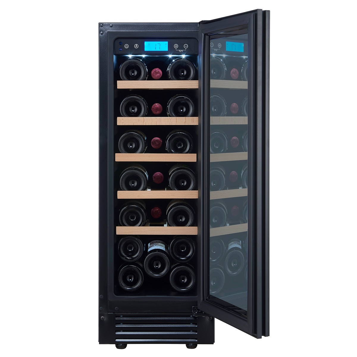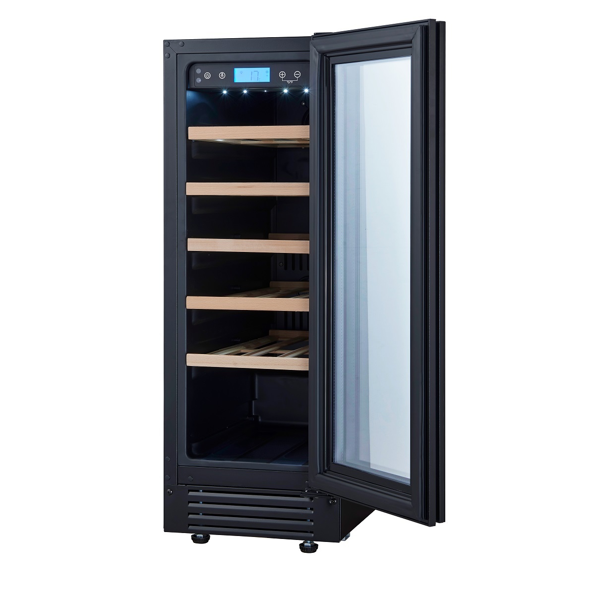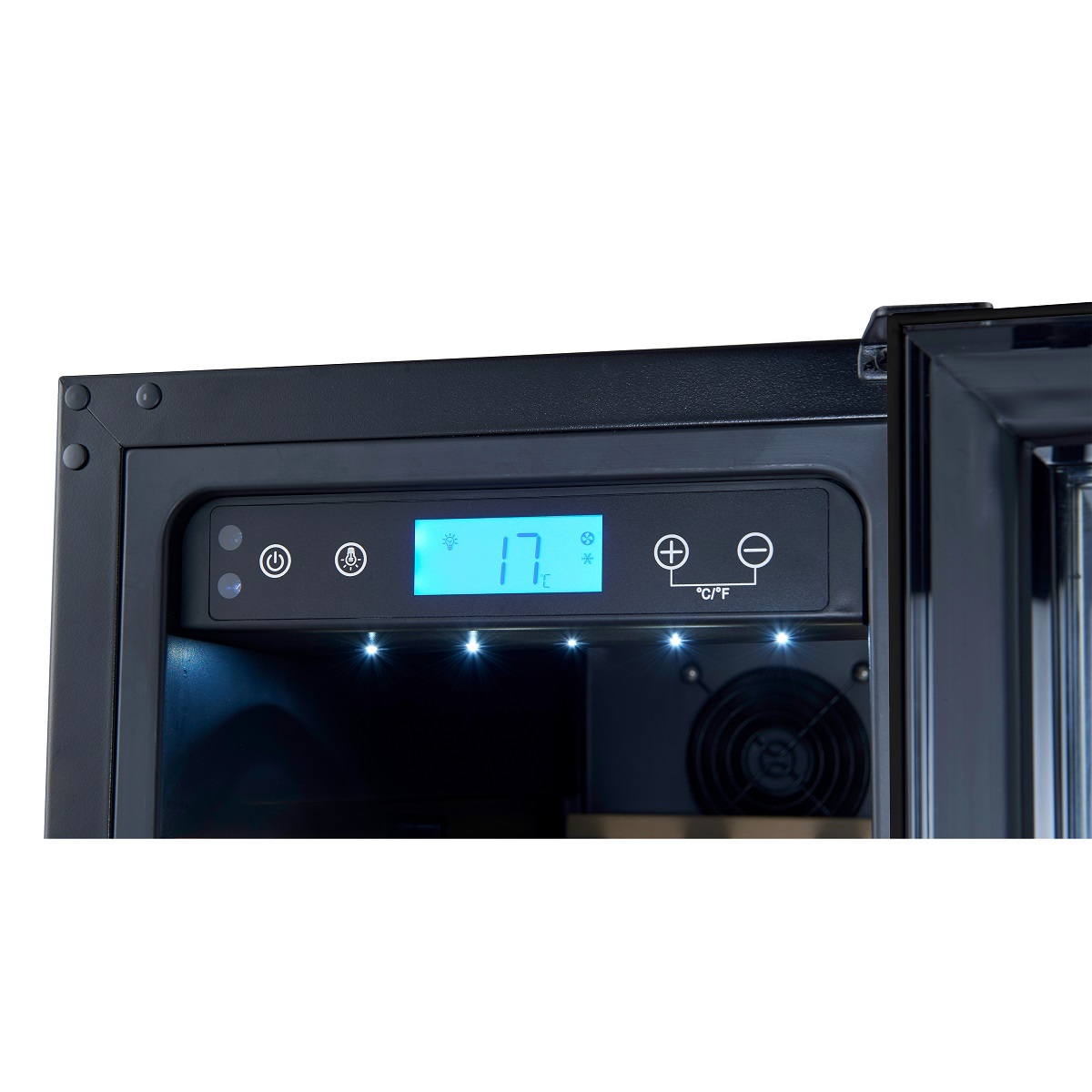 Сенсорные кнопки управления температурой и подсветкой за стеклянной дверцей.