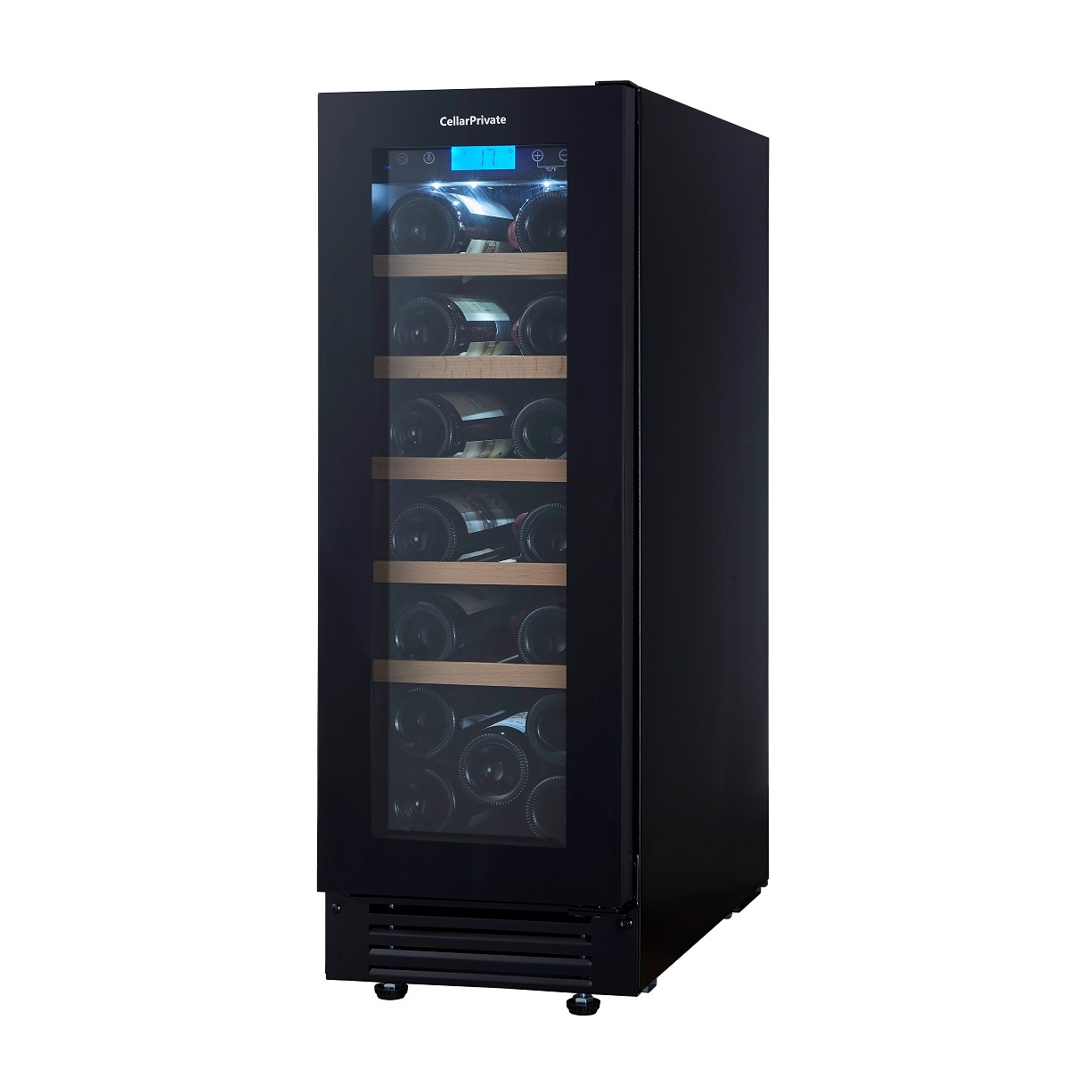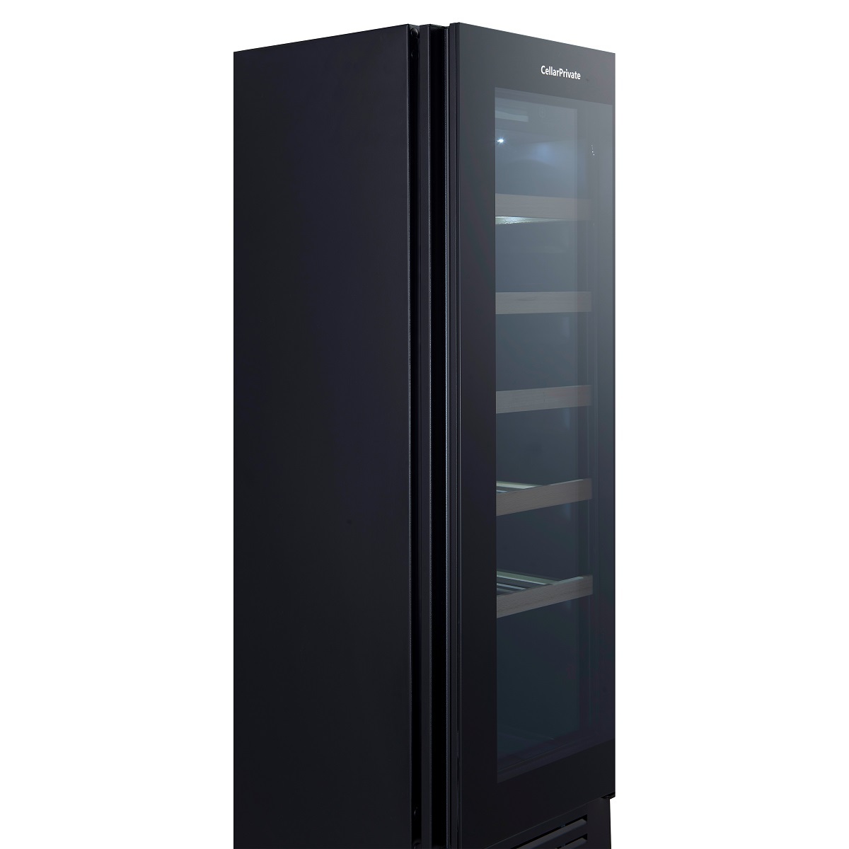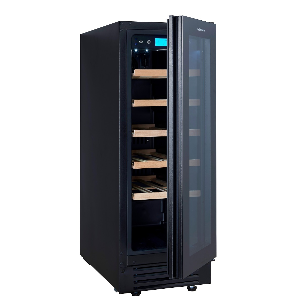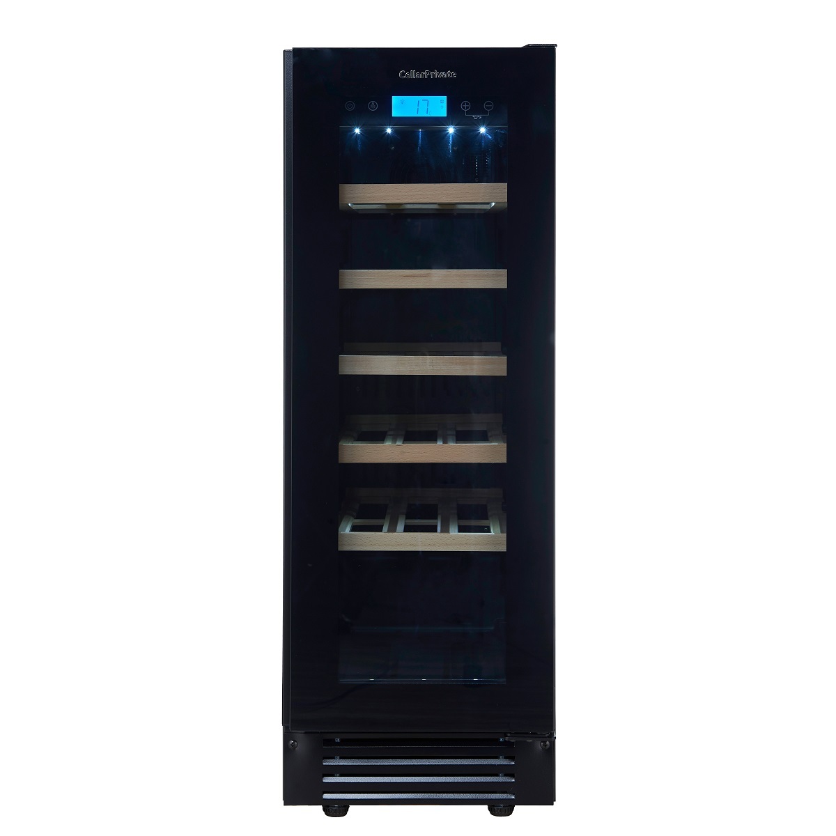 Сенсорные кнопки управления температурой и подсветкой за стеклянной дверцей.