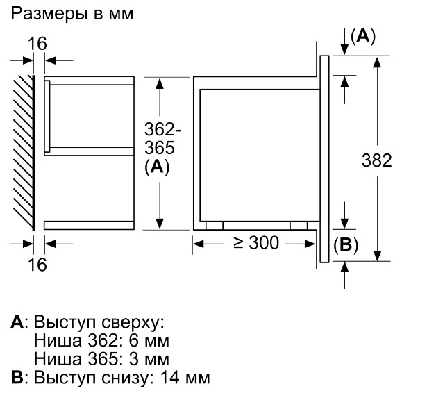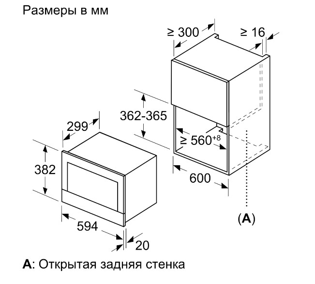 Размеры ниши для встраивания (ВхШхГ): 362 мм - 382 мм x 560 мм - 568 мм x 300 мм