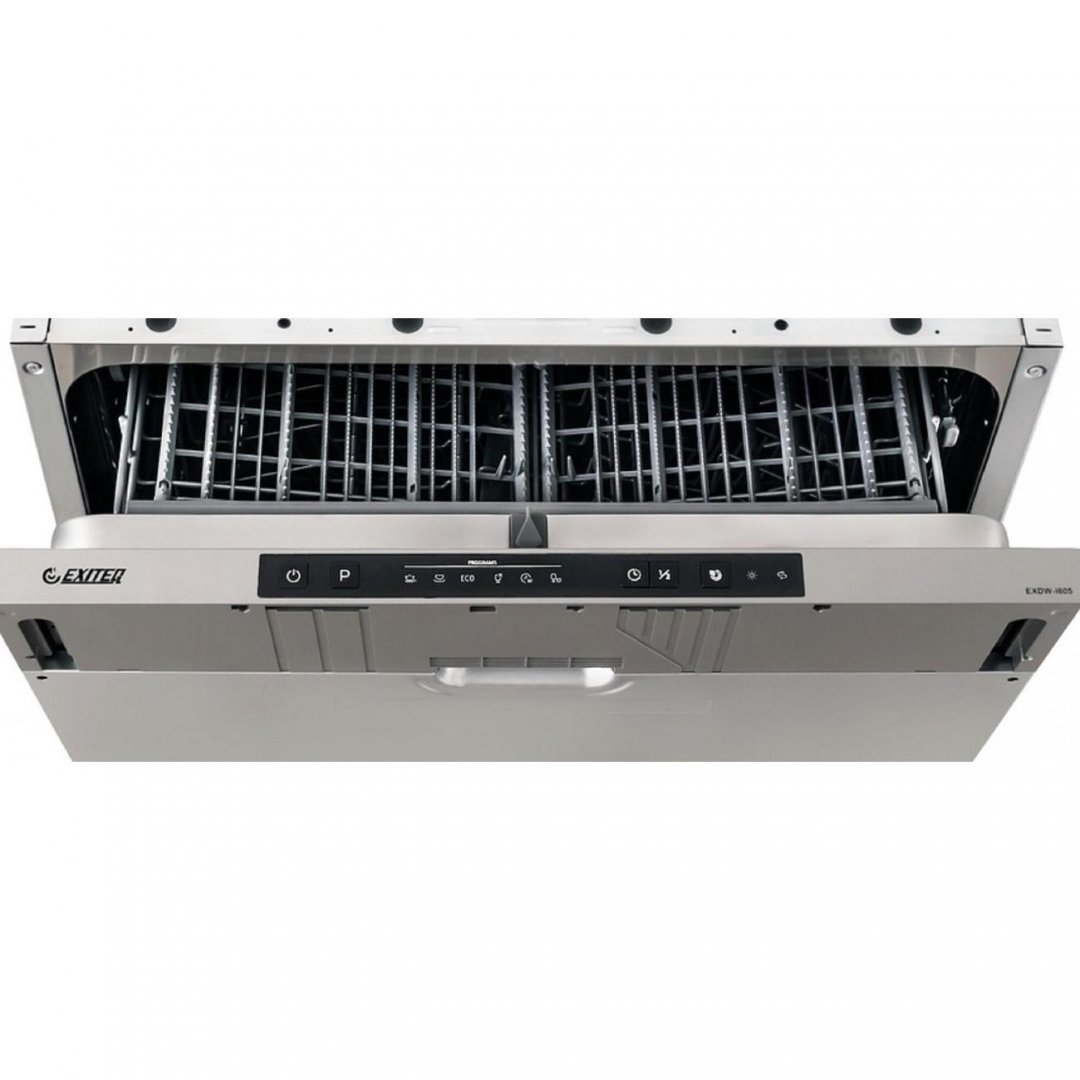 Exiteq EXDW-I605 - посудомоечная машина встраиваемого типа, которая полностью интегрируется в кухонный гарнитур благодаря стандартным габаритам - ширина 60 см, при этом вмещает десять наборов посуды. Предусмотрено шесть режимов, среди которых стандартный, интенсивный, быстрый, предварительное ополаскивание и мытье тонкого стекла. Доступна минипрограмма на 30 минут. Модель удобна в использовании благодаря опциям отсрочки запуска (максимальное - 9 часов), возможности половинной загрузки, освещения рабочей камеры и встроенному теплообменнику.