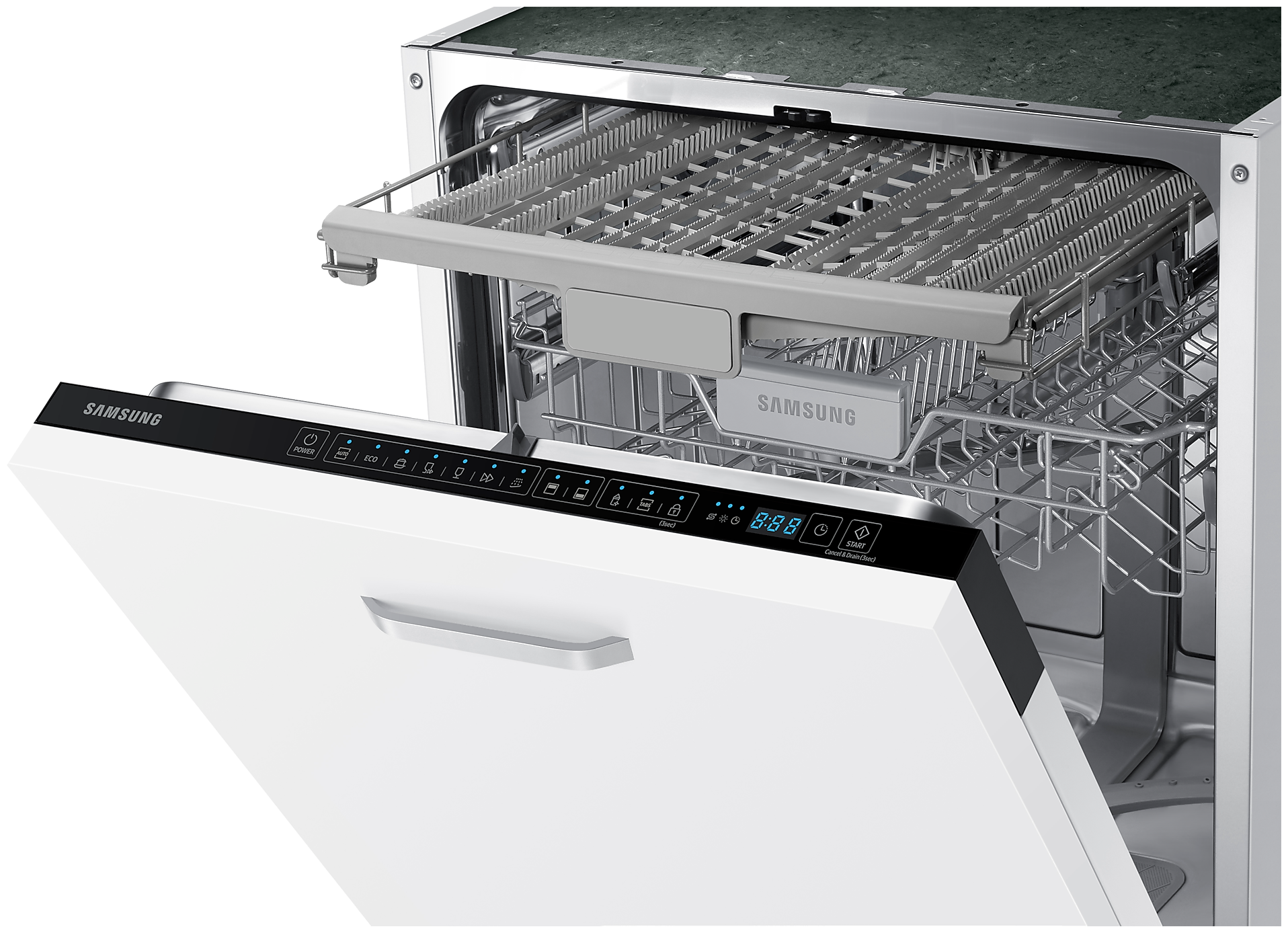 3я корзина, Поддон для столовых приборов, Половинная загрузка, Регулировка высоты корзин