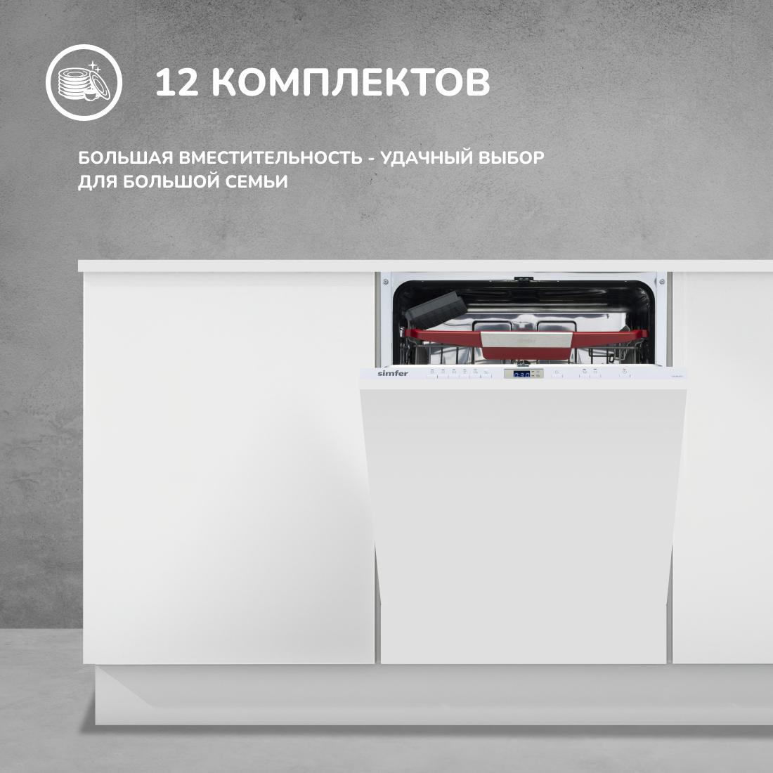 -Максимальная вместимость составляет 12 комплектов, что позволяет одновременно поместить большое количество посуды.