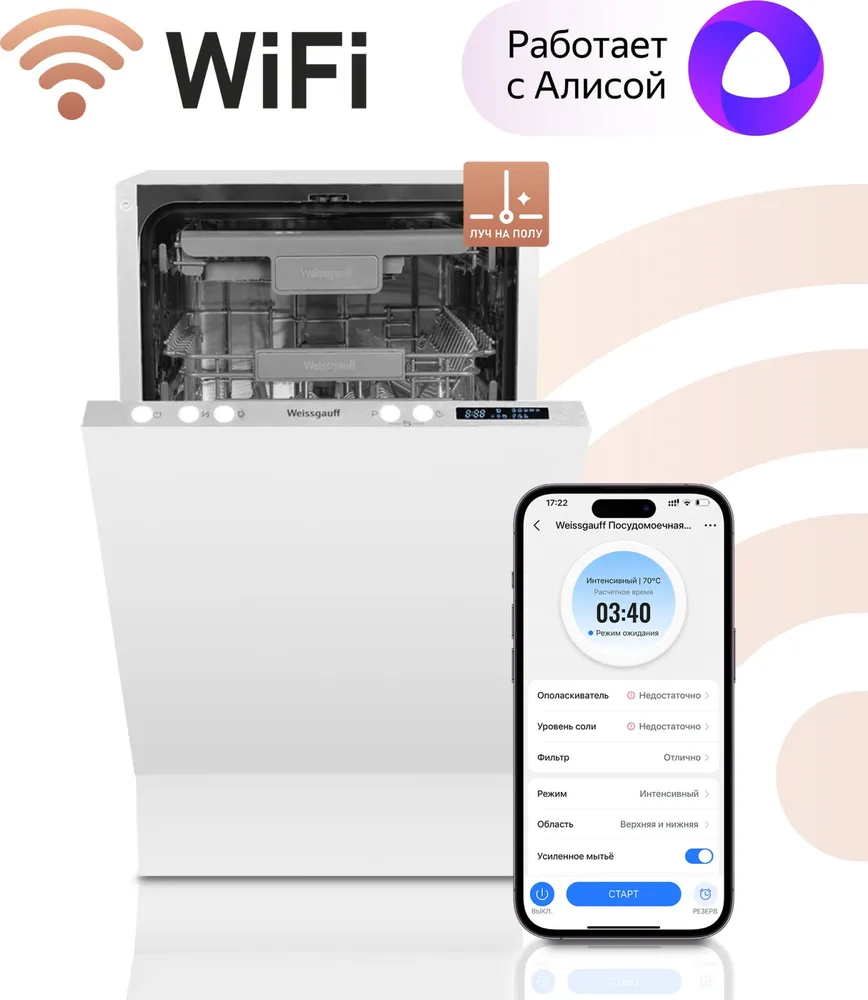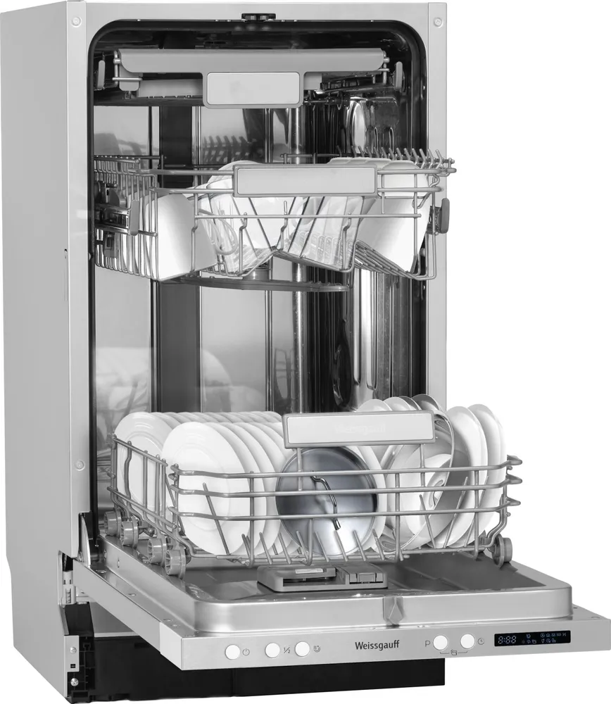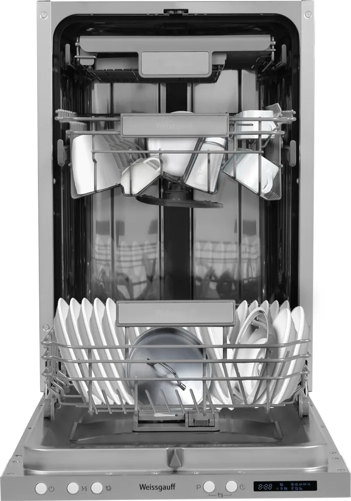 Особенности посудомоечной машины: Автоматическое открывание двери, Регулировка высоты корзин, Полка для чашек, Поддон для столовых приборов, Дисплей