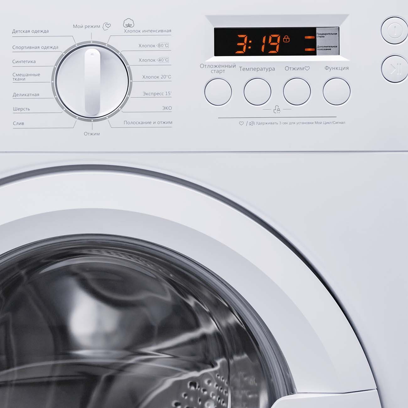 - Количество режимов стирки: 16 (Смешанные ткани, Хлопок - интенсивная, Хлопок 60/40/20֯ С, Шерсть, Деликатные ткани, Экспресс 15”, ECO стирка, Детские вещи, Спортивная одежда, Синтетика, Отжим, Слив, Полоскание и Отжим, Мой режим)