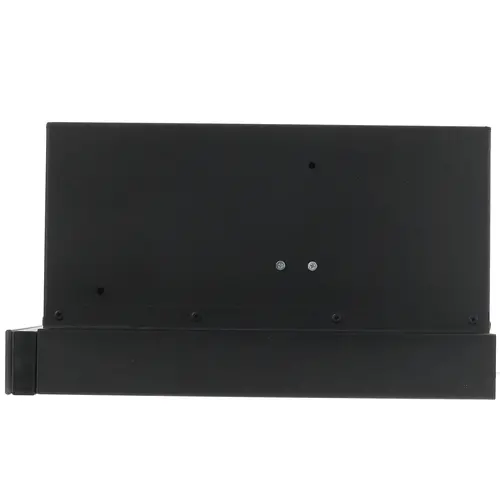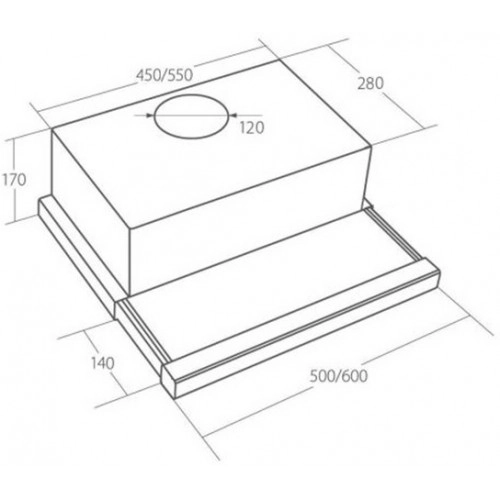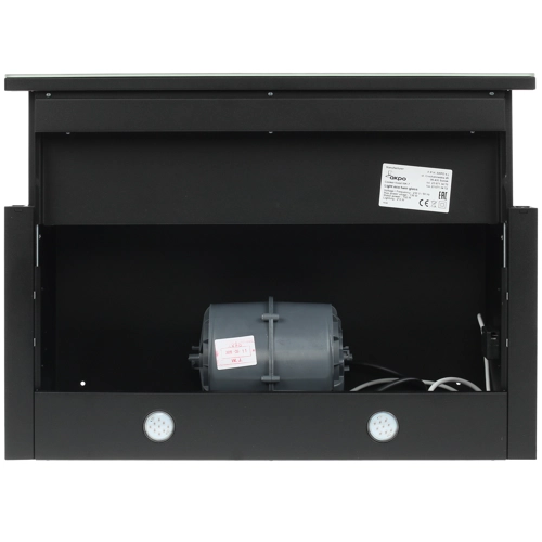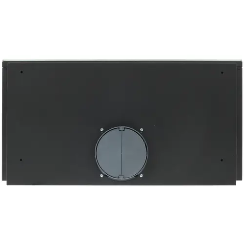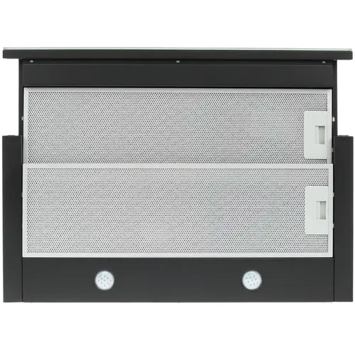 Корпус вытяжки телескопической выполнен из металла, а лицевая сторона выдвижной панели закрыта черным стеклом.