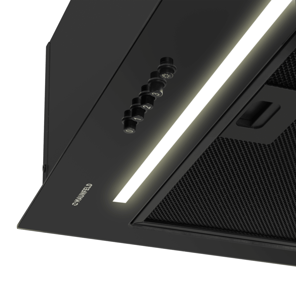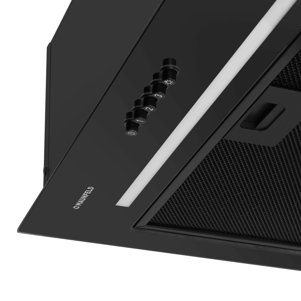 Удобное управление тремя рабочими скоростями и подсветкой вытяжки обеспечивает кнопочная панель. Чтобы прибор смог работать в режиме отвода, потребуется монтаж воздуховода. Для включения режима рециркуляции приобретите отдельно подходящий угольный фильтр.