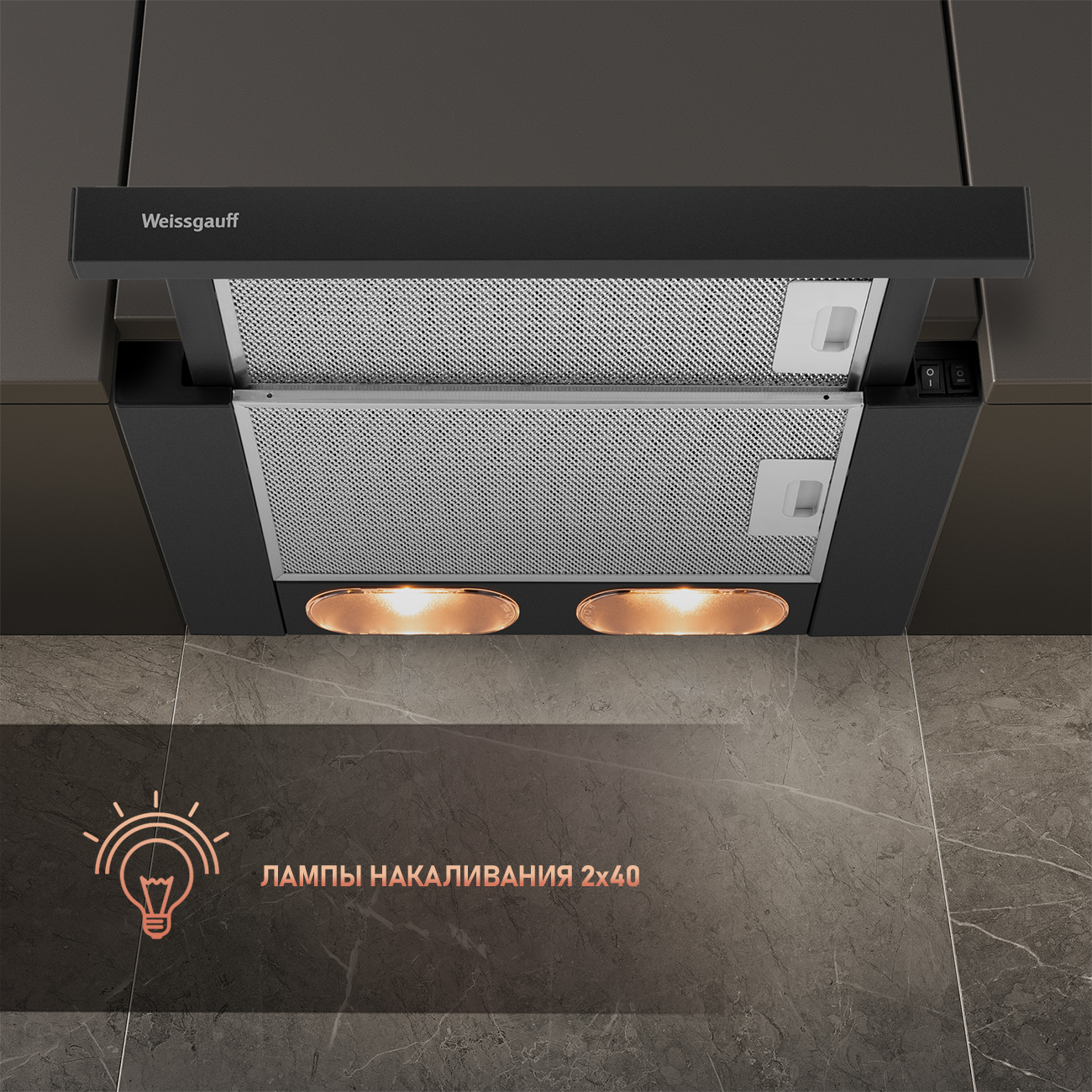 Освещение: лампы накаливания 2х40 Вт