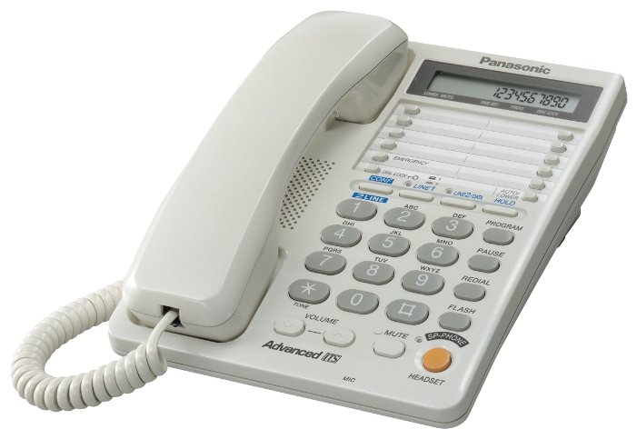 2 линии, трехсторонняя конференц-связь, отдельный звнок для каждой линии, ограничение вызовов, электронный регулятор мощности, цвет белый, две строки дисплея, индикатор набранного номера, счетчик времени разговора
