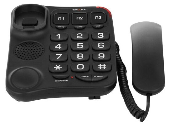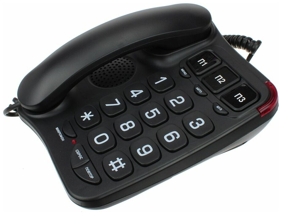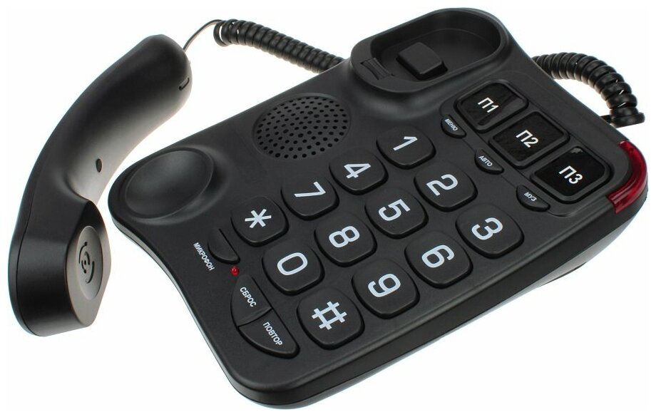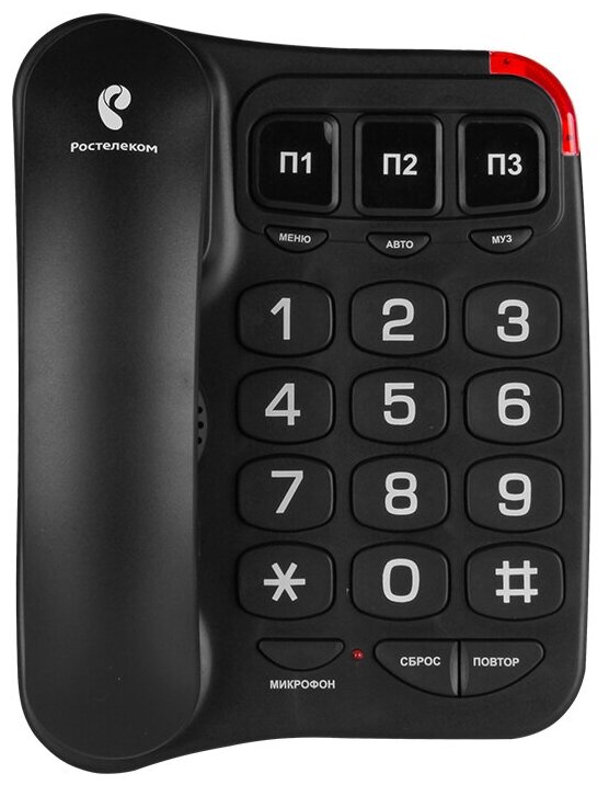 световая индикация вызывного сигнала; трубка 198x46x37 мм; базовый блок 217x158x61 мм; музыкальная пауза во время разговора