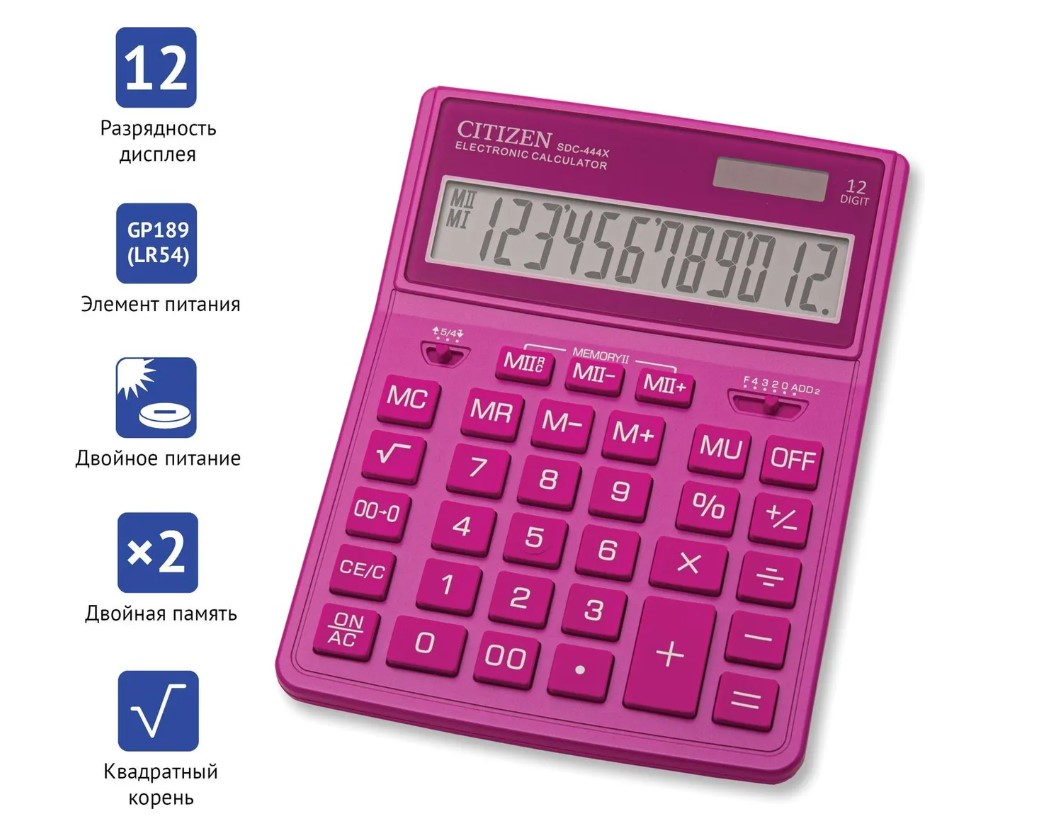 Оптимальный набор функций поможет автоматизировать расчеты: вычисление квадратного корня, коррекция последнего введенного значения, копка «00», двойная память, расчет наценки и кнопка выключения. Самая продаваемая модель в России по версии РБК в новом модном цвете! Выберите цвет, который подходит именно Вам.Гарантия 5 лет! Мир рассчитывает на Citizen!