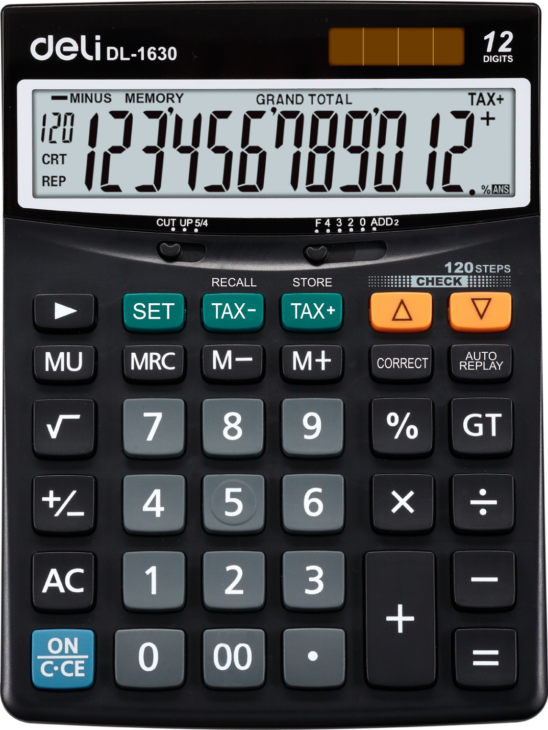 Калькулятор настольный, E1630, 188x140 мм, черныйБухгалтерский калькулятор Deli 1630 настольный в пластиковом корпусе с 12-разрядным ЖК-дисплеем. Имеет оптимальный набор вычислительных функций: основные математические операции, расчет процентов, извлечение квадратного корня, запоминание промежуточных результатов, вычисление налога и наценки. Позволяет корректировать введенное число. Удобная клавиатура снабжена кнопкой ввода двойного нуля. В калькуляторе имеется два источника питания. Размеры: 188х140х44 мм. В комплекте 1 батарейка LR44. 2VTB13