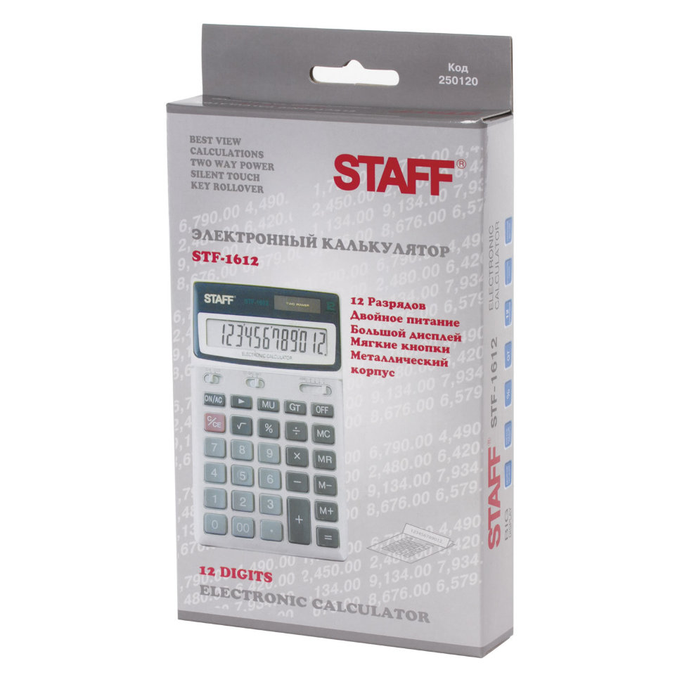 Настольный калькулятор STAFF STF-1612 в прочном металлическом корпусе выполняет все необходимые вычисления на работе и дома. Кнопки нажимаются легко и приятно, эргономичный наклон корпуса позволяет работать с максимальным комфортом.
