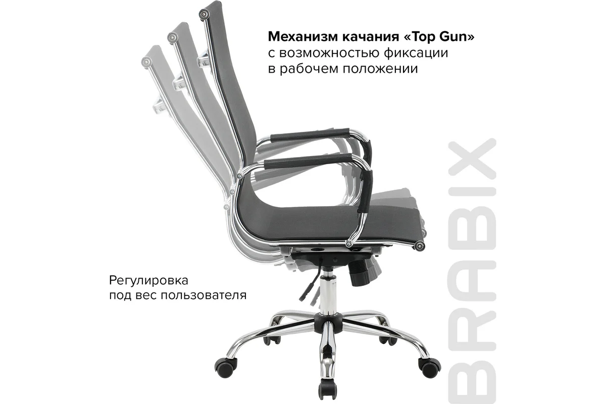 Надежный механизм качания "Top Gun" гарантирует хорошую поддержку спины и поясницы за счет возможности свободного качания с фиксацией в одном рабочем положении и регулировку угла наклона под вес сидящего.