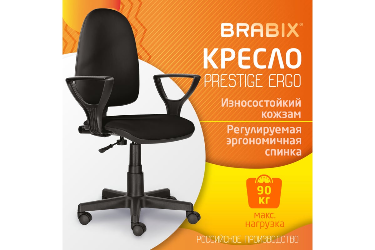 Кресло, регулируемая эргономичная спинка, кожзам, черное Z-11, BRABIX Prestige Ergo MG-311 531877 имеет прочное и надежное основание, которое выдерживает значительную нагрузку. Удобная регулировка помогает быстро настроить высоту. Размеры модели позволяют использовать ее в ограниченном пространстве кабинета.