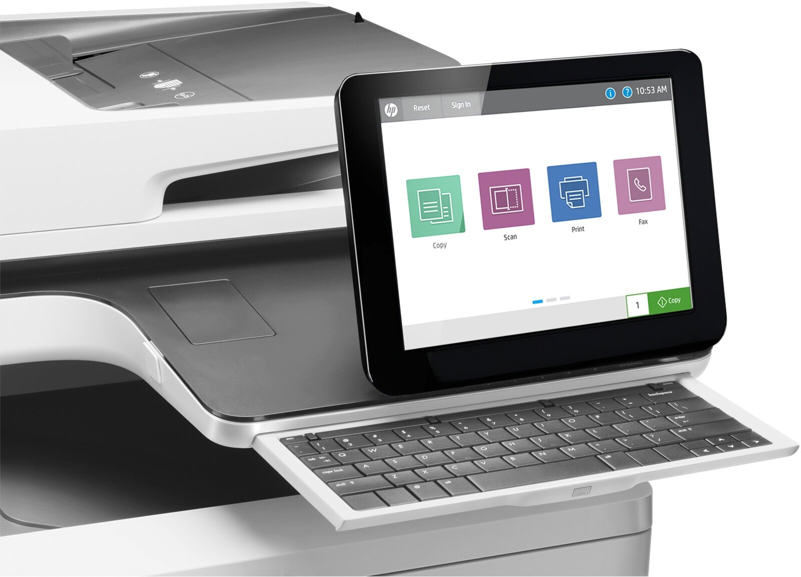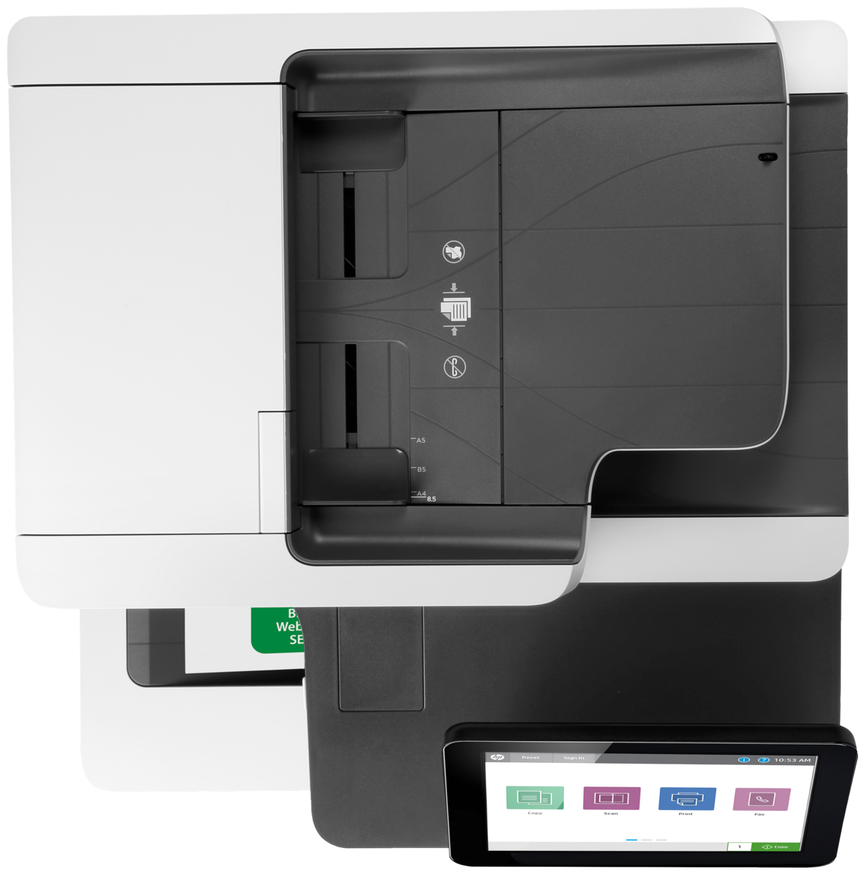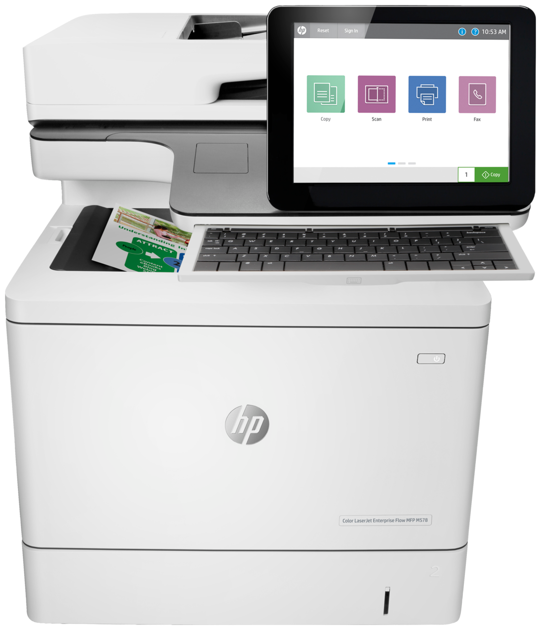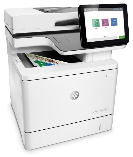 МФУ HP Color LaserJet Enterprise Flow M578c, 4 предустановленных лазерных картриджа HP LaserJet (ресурс черного картриджа — 5500 страниц, ресурс голубого, пурпурного и желтого картриджей — 3500 страниц), модуль сбора тонера, документация (в комплекте), кабель питания, кабель для факса