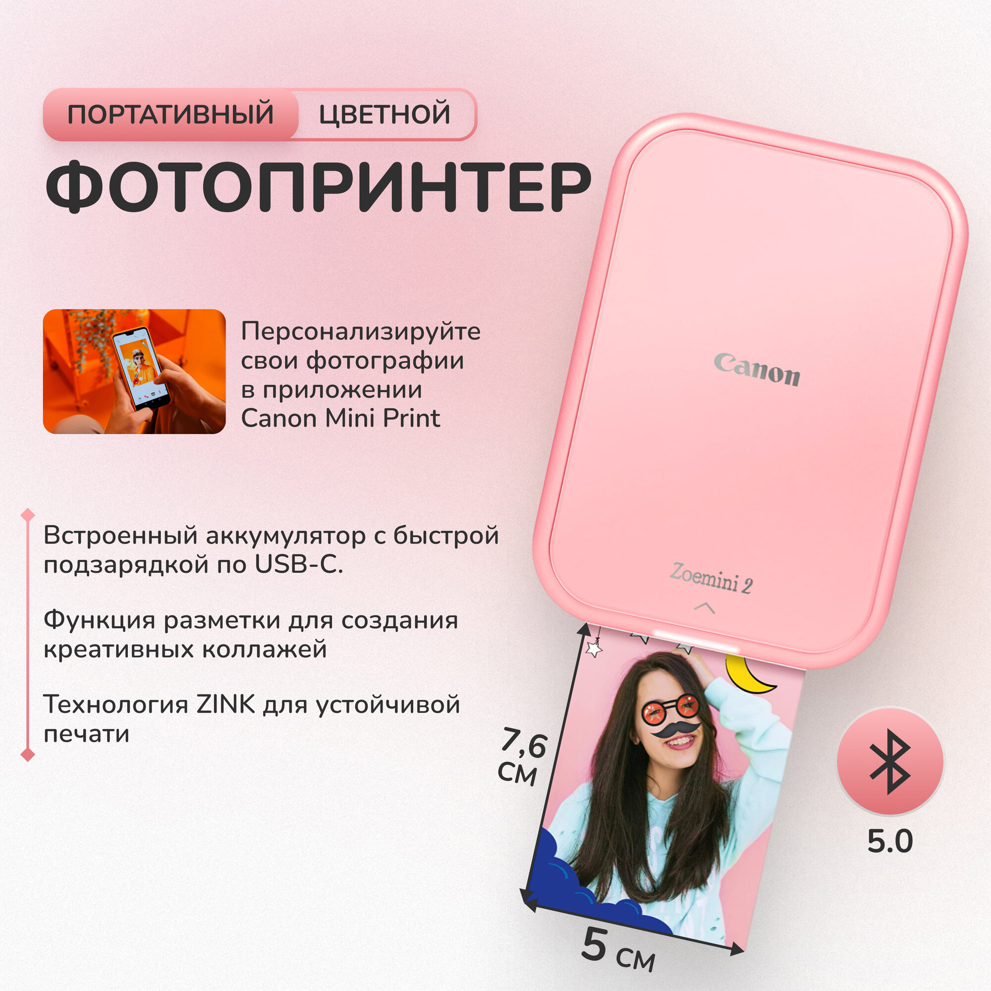 ZINK™ - технология печати без чернил. Печать по Bluetooth с помощью приложения Canon Mini Print