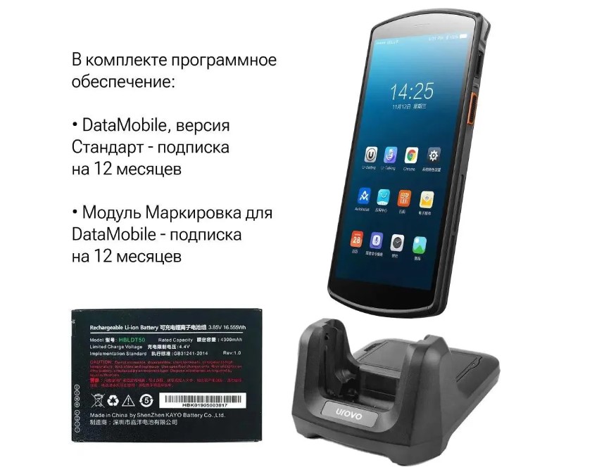 ТСД, кабель, ЗУ, кредл, 2x Акб, ПО DataMobile Стандарт - 12 мес. (DM12M), ПО DataMobile Модуль Маркировка - 12 мес. (DMMODULMARK12M)