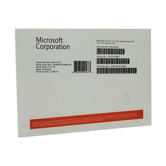 ПО Право Microsoft Windows Server CAL 2012, Russian, 5 Client, Device CAL, DSP OEI (R18-03692-L) Строго с 170345