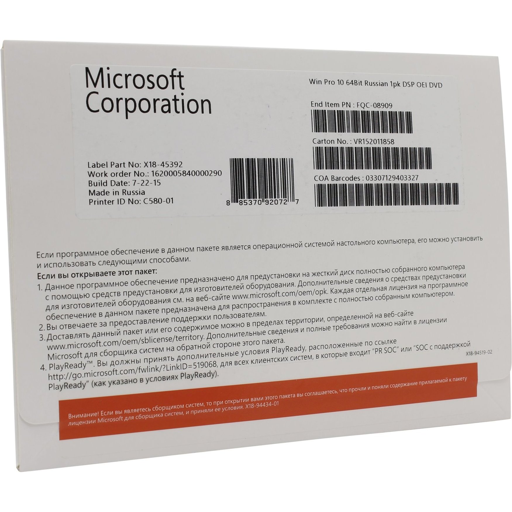 ПО Установ. комплект Microsoft Windows 10 Home, 64-bit, Russian, DVD, DSP OEI (KW9-00132-D) (только с 190259)