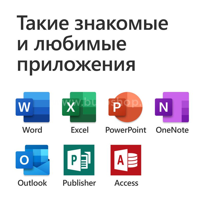 Word, Excel, PowerPoint, Outlook, OneNote, Publisher(только ПК), Access (только ПК)