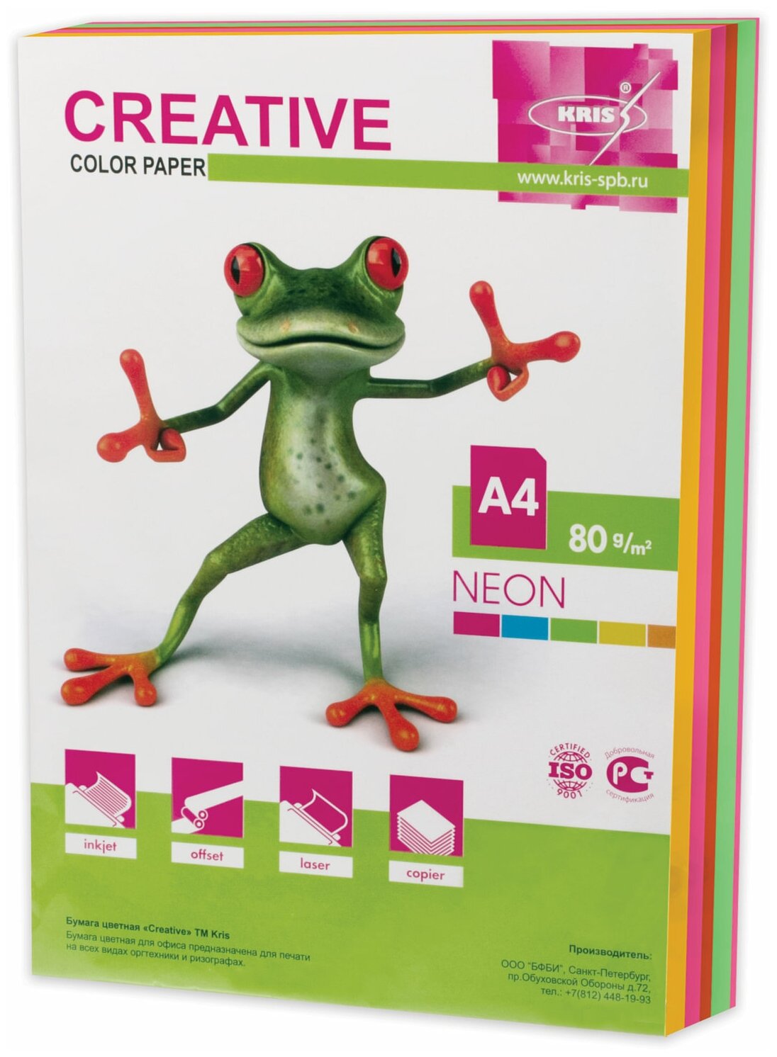 Бумага цветная Creative color, А4, 80 г/м2, 250 л., (5 цветов х 50 листов) микс неон, БНpr-250r