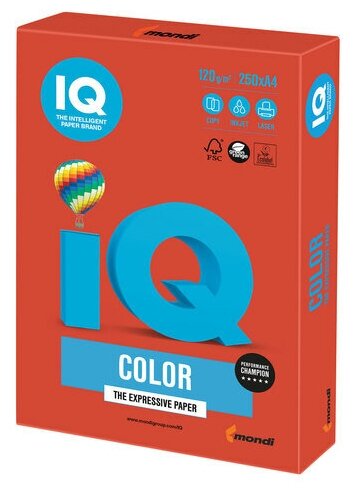 Первоклассная цветная бумага IQ интенсивного цвета обеспечивает превосходное качество при копировании, печати на лазерном или струйном принтере. Формат: А4, Плотность: 120 г/м2, Количество листов в пачке: 250, Количество цветов в пачке: 1, Тон: интенсивный, Оттенок: красный, Класс: А, Чистота цвета: да, Высокая стойкость к выцветанию: да, Сертифицирована по экологическим стандартам FSC и EU Ecolabel: да, Соответствует европейскому стандарту безопасности игрушек: да.