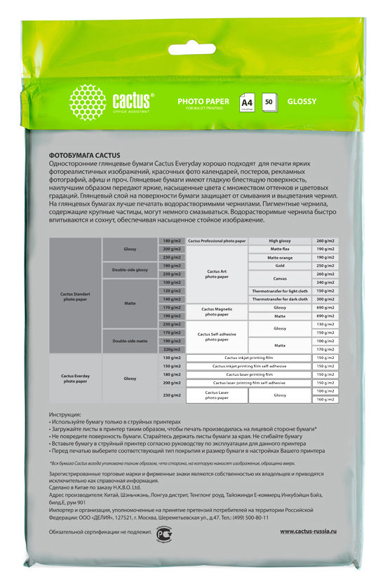 Фотобумага Cactus CS-GA415050ED A4/150г/м2/50л/белый глянцевое для струйной печати