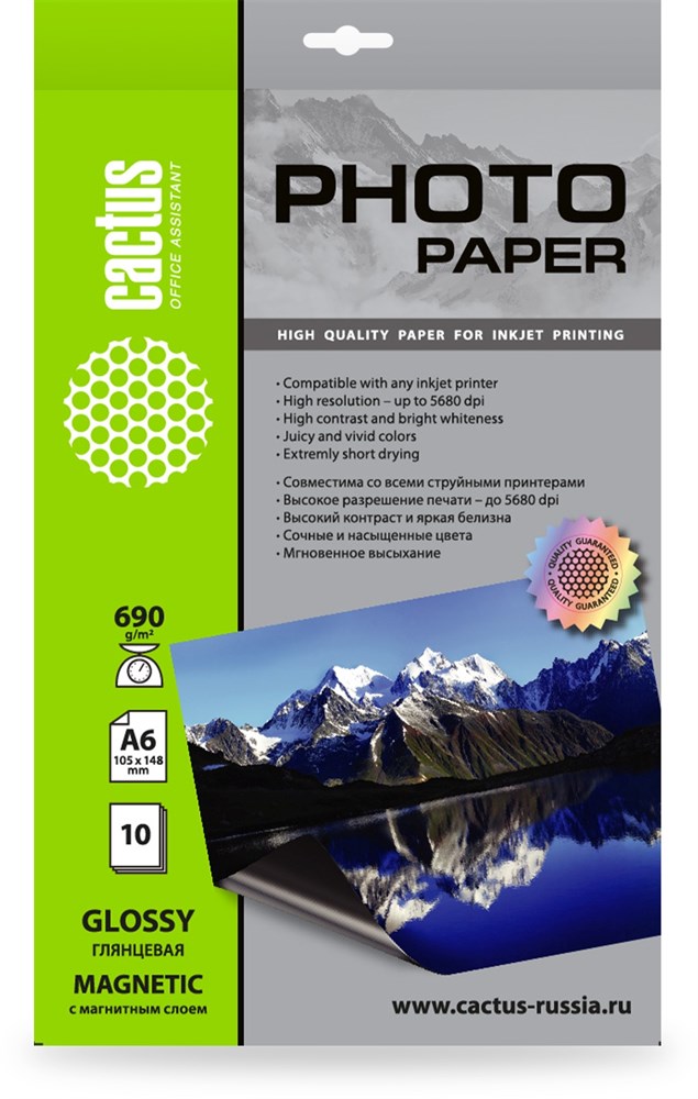 Фотобумага CACTUS CS-MGA669010 A6/690 г/м2, 10 листов, белый глянцевое/магнитный слой для струйной печати 1033436 предназначена для распечатки бизнес-графики, презентаций, флаеров и фотографий.