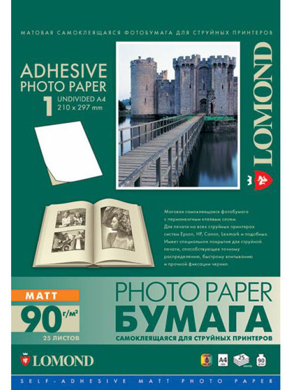 Фотобумага Lomond 2210003 относится к продукции самоклеящегося типа. Лист можно снять с основания и зафиксировать на определенной поверхности. Применялся качественный состав для нанесения, клей обеспечивает надежное крепление.