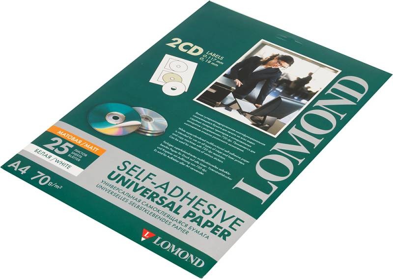 Самоклеящаяся бумага Lomond 2101013 активно используется для CD\DVD-дисков матовая . Изделие подходит для различных струйных или лазерных принтеров, осуществляемых печать с разрешением 720 dpi.