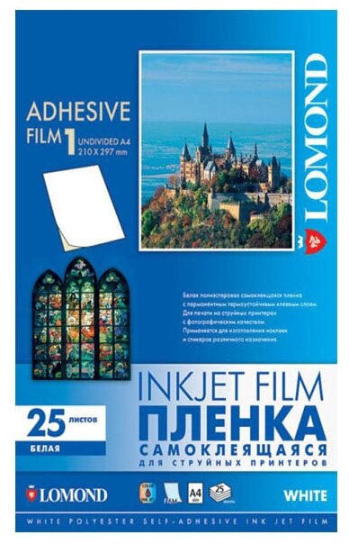 LOMOND PET Self-Adhesive White Ink Jet Film – белая самоклеящаяся, А4, 100 мкм, 25 листов Непрозрачные полиэстеровые самоклеящиеся пленки Lomond PET Self-Adhesive Ink Jet Film предназначены для изготовления наклеек и стикеров различного назначения. Обратная сторона таких пленок имеет адгезивное покрытие. Специальное покрытие лицевой стороны обеспечивает получение четких текстов, фотографическое качество изображений, точную цветопередачу. Пленки не смазываются при печати, быстро сохнут, не выцветают. Совместимы как с водорастворимыми, так и с пигментными чернилами. Изображения на пленках устойчивы к внешним воздействиям, долговечны. Пленки антистатичны и термостабилизированы.