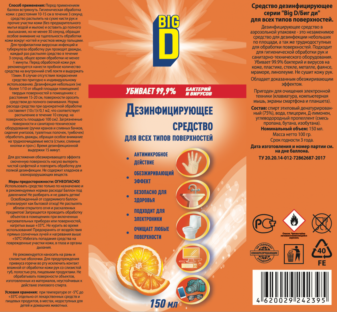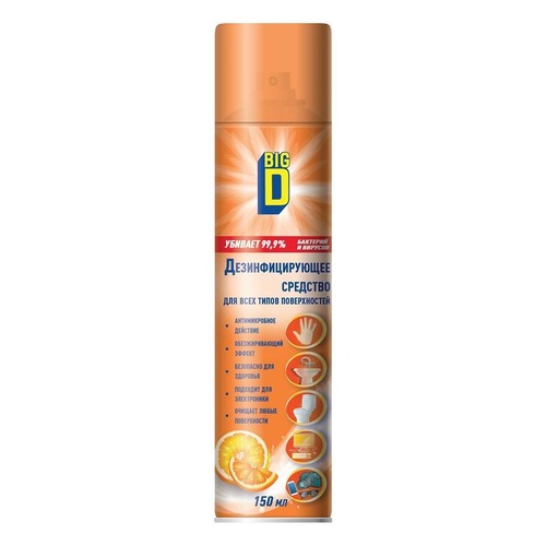 Описание: Дезинфицирующее средство в аэрозольной упаковке – это незаменимо для дезинфекции небольших по площади, а так же труднодоступных для обработки поверхностей. Подходит для гигиенической обработки рук и санитарно-технического оборудования. Убивает 99,9% бактерий и вирусов на коже, пластике, стекле др.