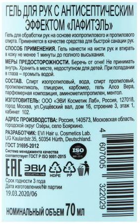 Состав: спирт изопропиловый (52%), вода, спирт пропиловый (13%), пропиленгликоль, глицерин, парфюмерная композиция, гель Алоэ Вера.