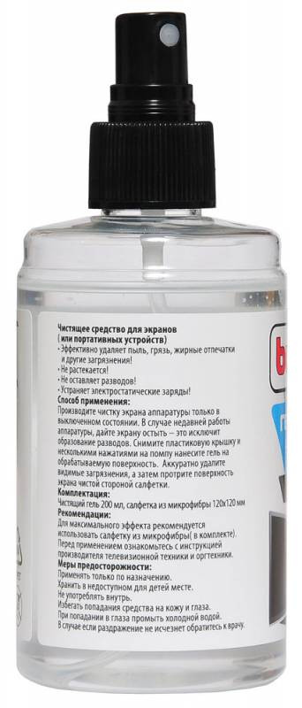 Описание: Чистящий набор состоит из геля-очистителя и салфетки из микроволокна. Предназначен для очистки экранов и оптики от грязи, пыли и отпечатков пальцев. Не оставляет разводов, не содержит спирт.