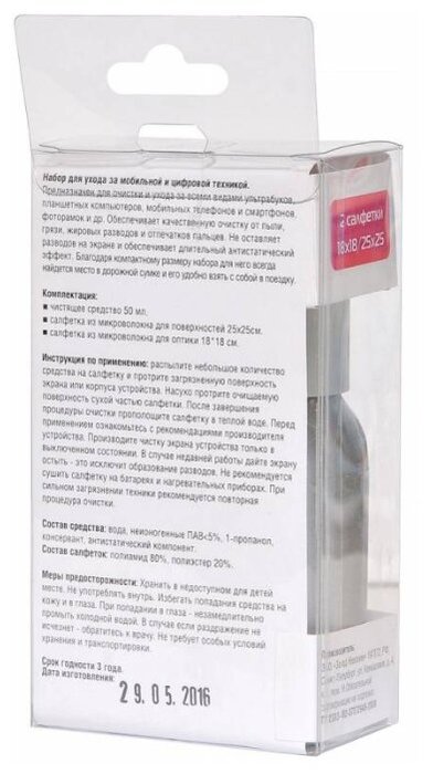 Описание: Портативный чистящий набор для планшетов и смартфонов. Предназначен для очистки от пыли, грязи и отпечатков пальцев. В набор входит чистящий гель, создающий антистатический эффект и салфетка из микроволокна для очистки поверхностей от разводов и отпечатков.