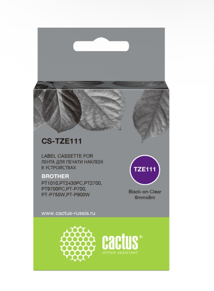 Картридж ленточный Cactus CS-TZE111: черный текст на прозрачном фоне, ширина ленты 6 мм, длина 8 м. Ламинированная лента для печати наклеек подходит для маркировки любых предметов, от кабеля, трубопровода и оборудования, до папок и полок. Наклейки обладают хорошей устойчивостью к экстремальным температурам, трению, воздействию химикатов и солнечного света. Можно использовать на открытом воздухе.
