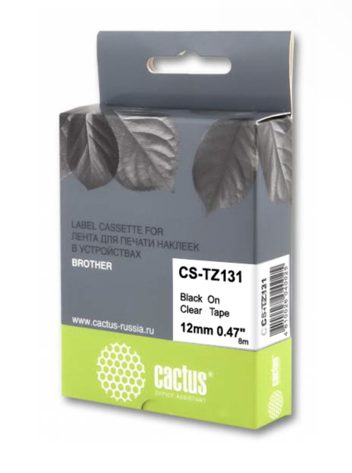 Картридж ленточный Cactus CS-TZ131: черный текст на прозрачном фоне, ширина ленты 12 мм, длина 8 м. Ламинированная лента для печати наклеек подходит для маркировки любых предметов, от кабеля, трубопровода и оборудования, до папок и полок. Наклейки обладают хорошей устойчивостью к экстремальным температурам, трению, воздействию химикатов и солнечного света. Можно использовать на открытом воздухе.