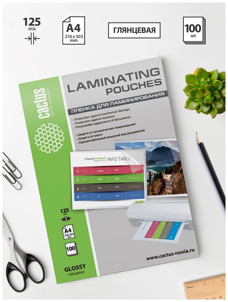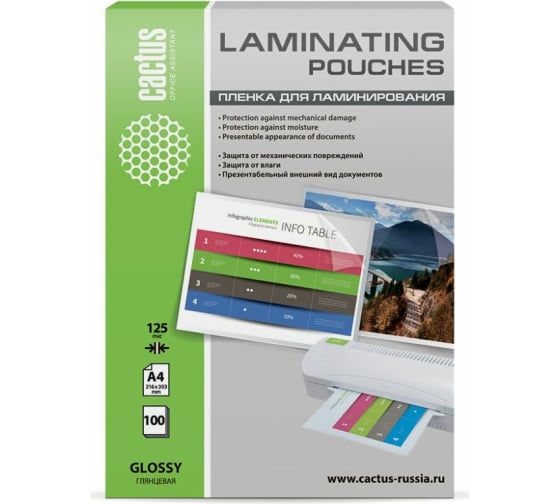 Пленка для ламинирования Cactus 125 мкм, А4, глянцевая, 216x303 мм, 100 шт. CS-LPGA4125100 предназначена для ламинирования различных документов, визиток и фотографий, полиграфической и рекламной продукции. Пленка придает документам опрятный вид и позволяет обеспечить их надежную и долгосрочную защиту от влаги, жира, пыли, царапин, выцветания, износа и механических повреждений. Глянцевое ламинирование печатной продукции придает поверхности глянцевый блеск, благодаря чему цвета на изображении получаются более яркими и насыщенными. Срок службы ламинированных изделий значительно выше.