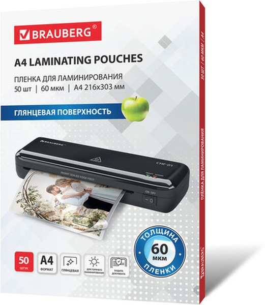 Пленка для ламинирования BRAUBERG формата А4 (216х303 мм) имеет уникальный состав: полиэтилентерефталат (PET), этиленвинилацетат (EVA), полиэтилен (LDPE). Промежуточный слой полиэтилена (LDPE) выступает как связующий элемент между слоями PET и EVA, служит дополнительной защитой от вероятного вытекания клея из-под пленки при ламинировании. Полиэтилен (PE) придает пакетам прочность эластичность и износостойкость. Глянцевое покрытие пленки способствует сохранению и максимальной передаче цвета ламинируемого изображения.