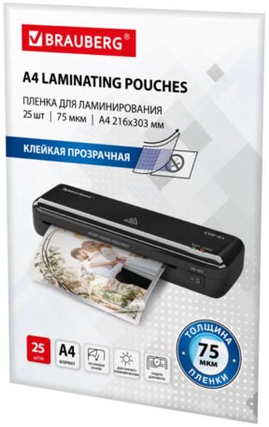 Пленка для ламинирования BRAUBERG формата А4 (216х303 мм) имеет уникальный состав: полиэтилентерефталат (PET), этиленвинилацетат (EVA), полиэтилен (LDPE). Промежуточный слой полиэтилена (LDPE) выступает как связующий элемент между слоями PET и EVA, служит дополнительной защитой от вероятного вытекания клея из-под пленки при ламинировании. Полиэтилен (PE) придает пакетам прочность эластичность и износостойкость. Глянцевое покрытие пленки способствует сохранению и максимальной передаче цвета ламинируемого изображения.