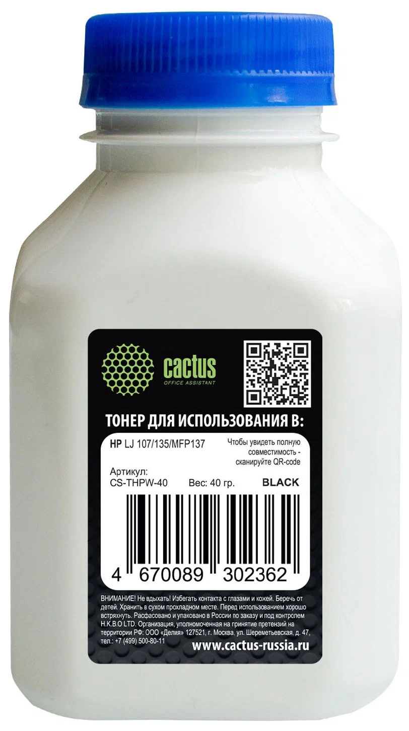 Тонер Cactus CS-THPW-40 для заправки картриджей HP LJ 107/ 135/ MFP137/ 408/ MFP432 черный, флакон, 40 г Компания CACTUS на протяжении десяти лет является одним из ведущих брендов совместимых расходных материалов к печатающей и множительной технике для дома и офиса в России. Продукция CACTUS создана для безупречной работы с вашим принтером или МФУ. Вы можете рассчитывать на профессиональное качество комплектующих и тонера от мировых брендов. Они обеспечивают стабильное качество печати, а также экономят вашу бумагу, время и средства.
