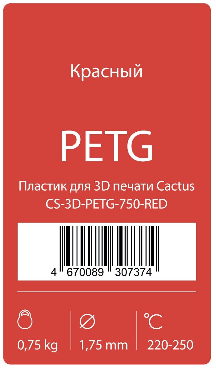Печать с использованием Cactus CS-3D-PETG-750 доступна в температурных пределах 220-250 ℃. Пластик поставляется в катушке, с толщиной нити 1.75 мм.
