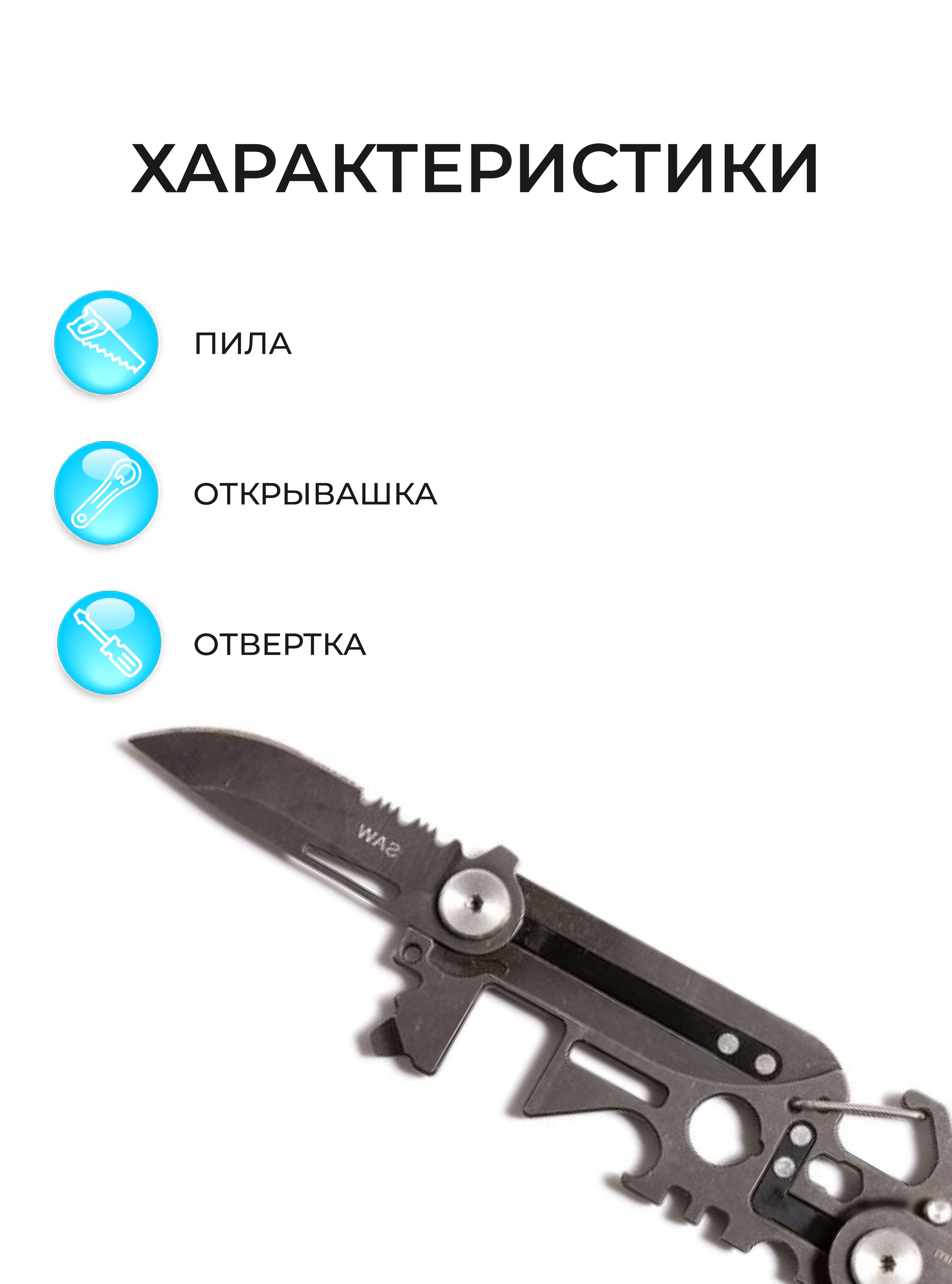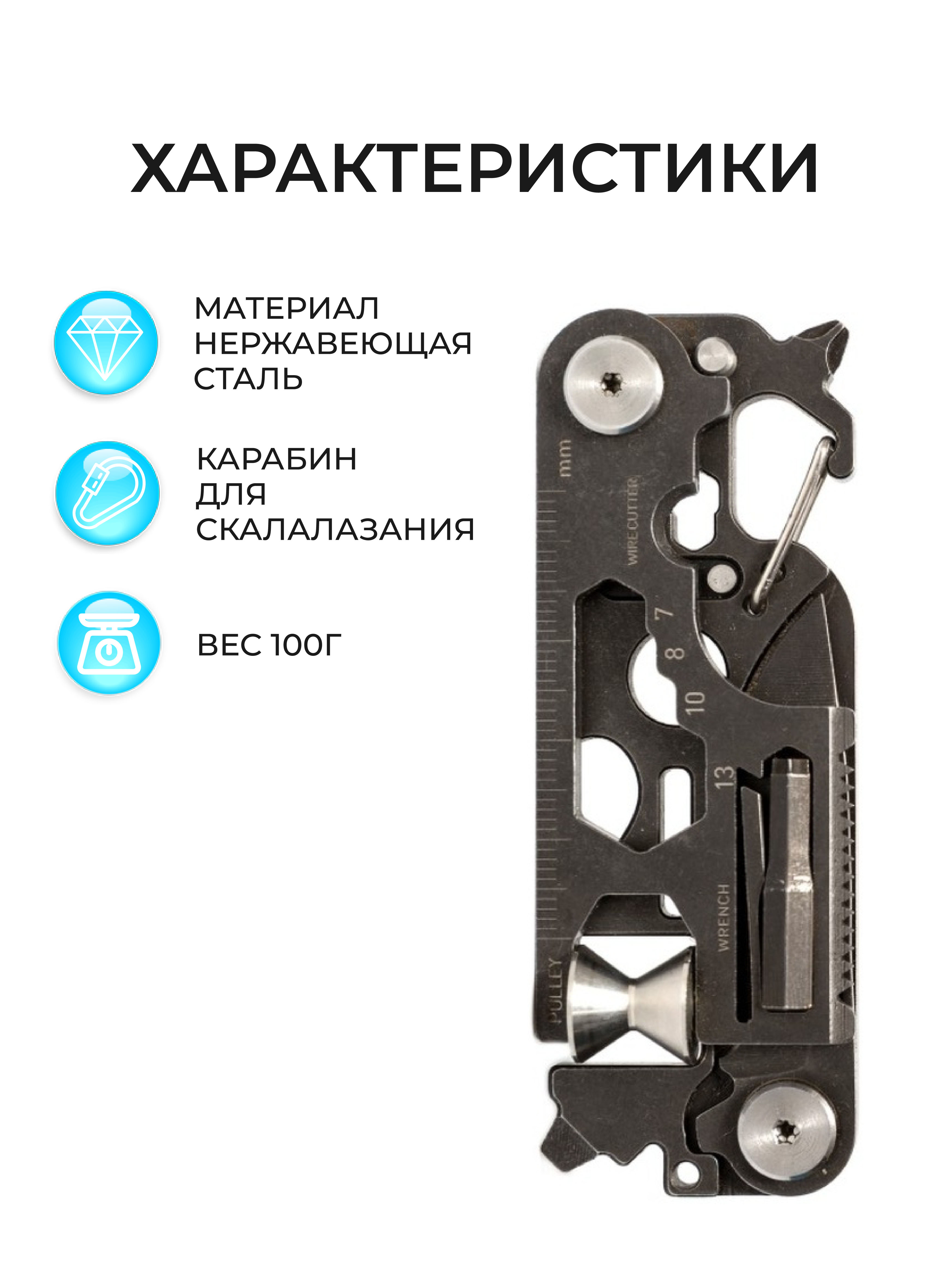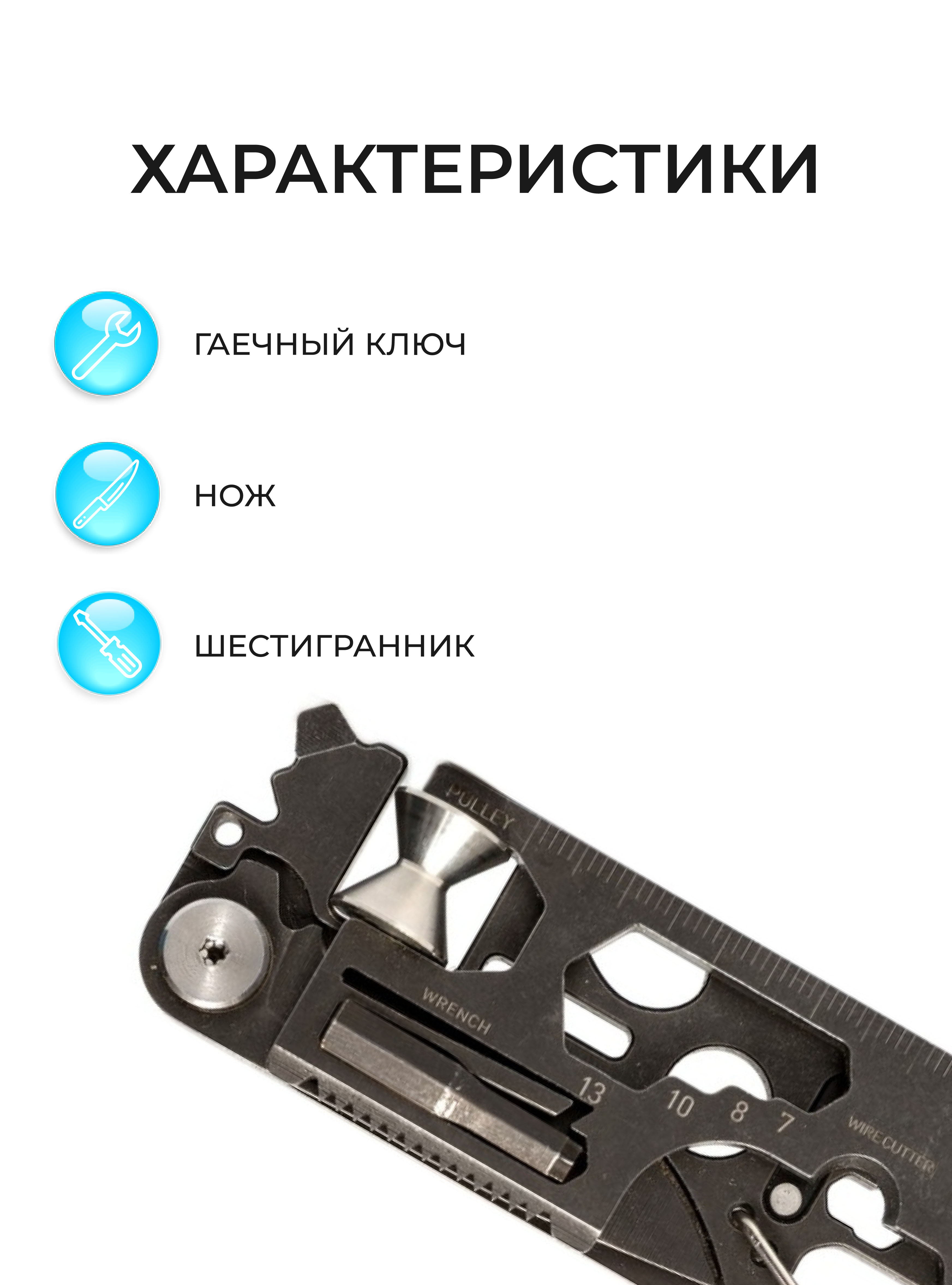 Он также имеет отвертку Philips и отвертку с плоской головкой. Полукруг на обоих концах инструмента представляет собой прорезь для проводов, чтобы было легче закрепить провод/веревку или скрутить толстую проволоку. Наряду с многофункциональной линейкой 4,5 см длинная линейка представляет собой удобный измерительный инструмент для мгновенных измерений..